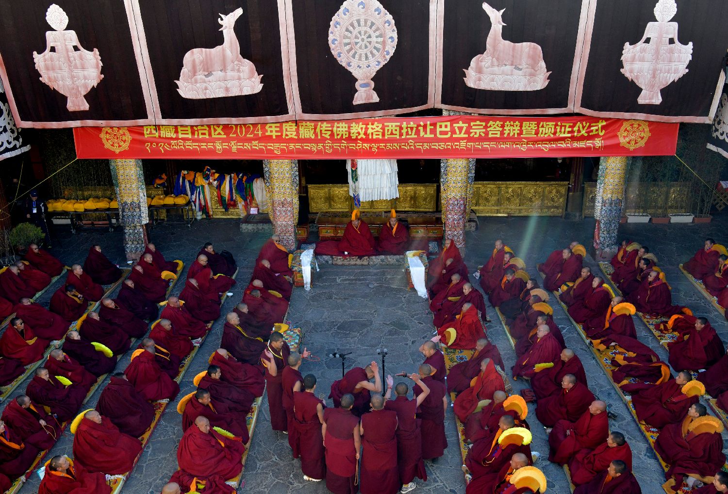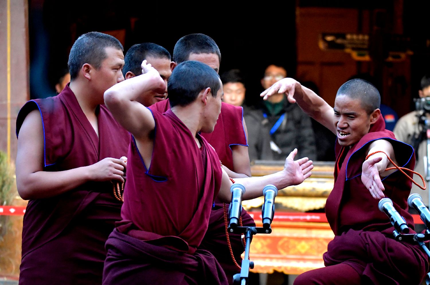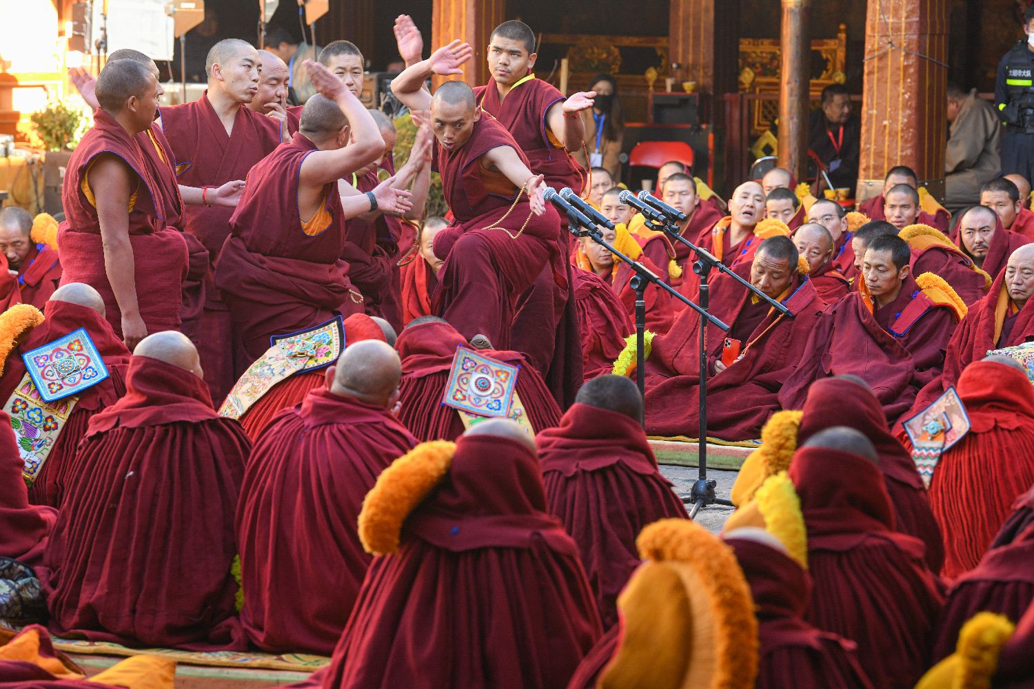 陪考僧人围绕藏传佛教五部经典向考僧提问。(中新社)
