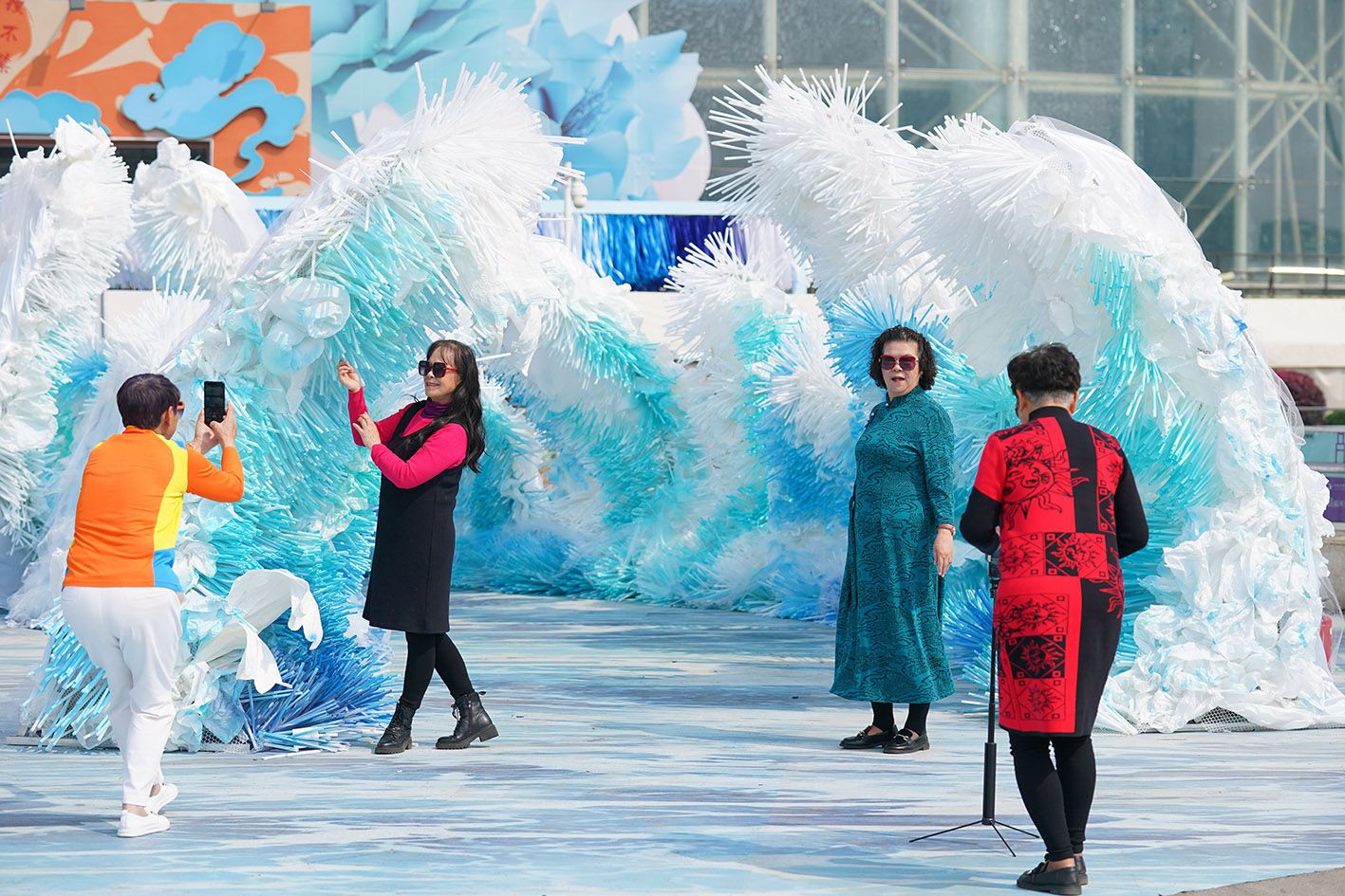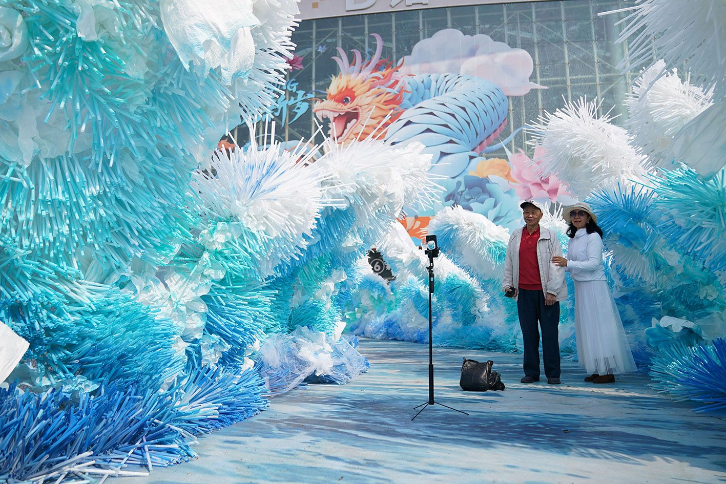 3月12日,市民在用数万根环保材料吸管打造成的“梦幻海浪”艺术装置前拍照。(中新社)