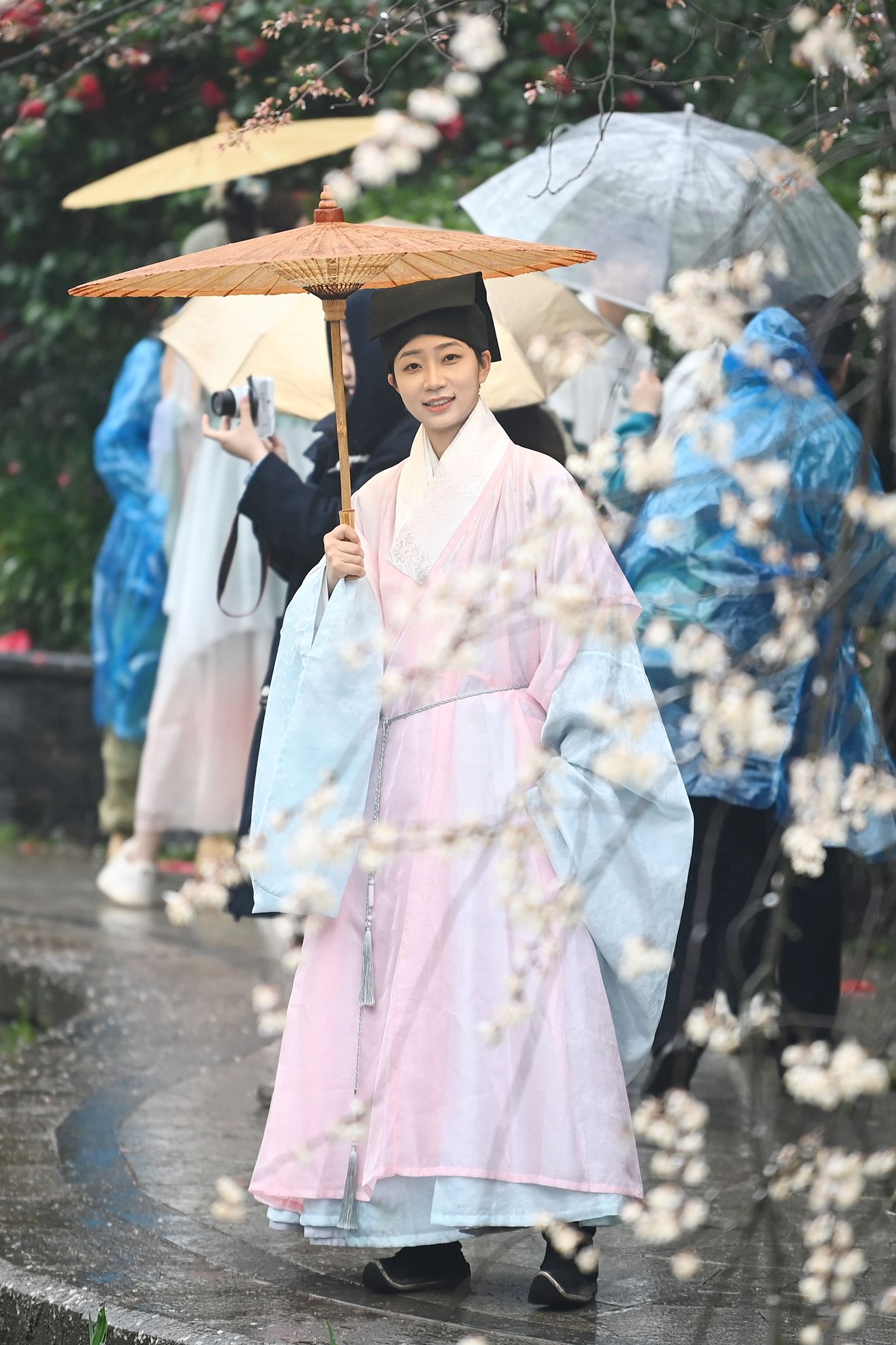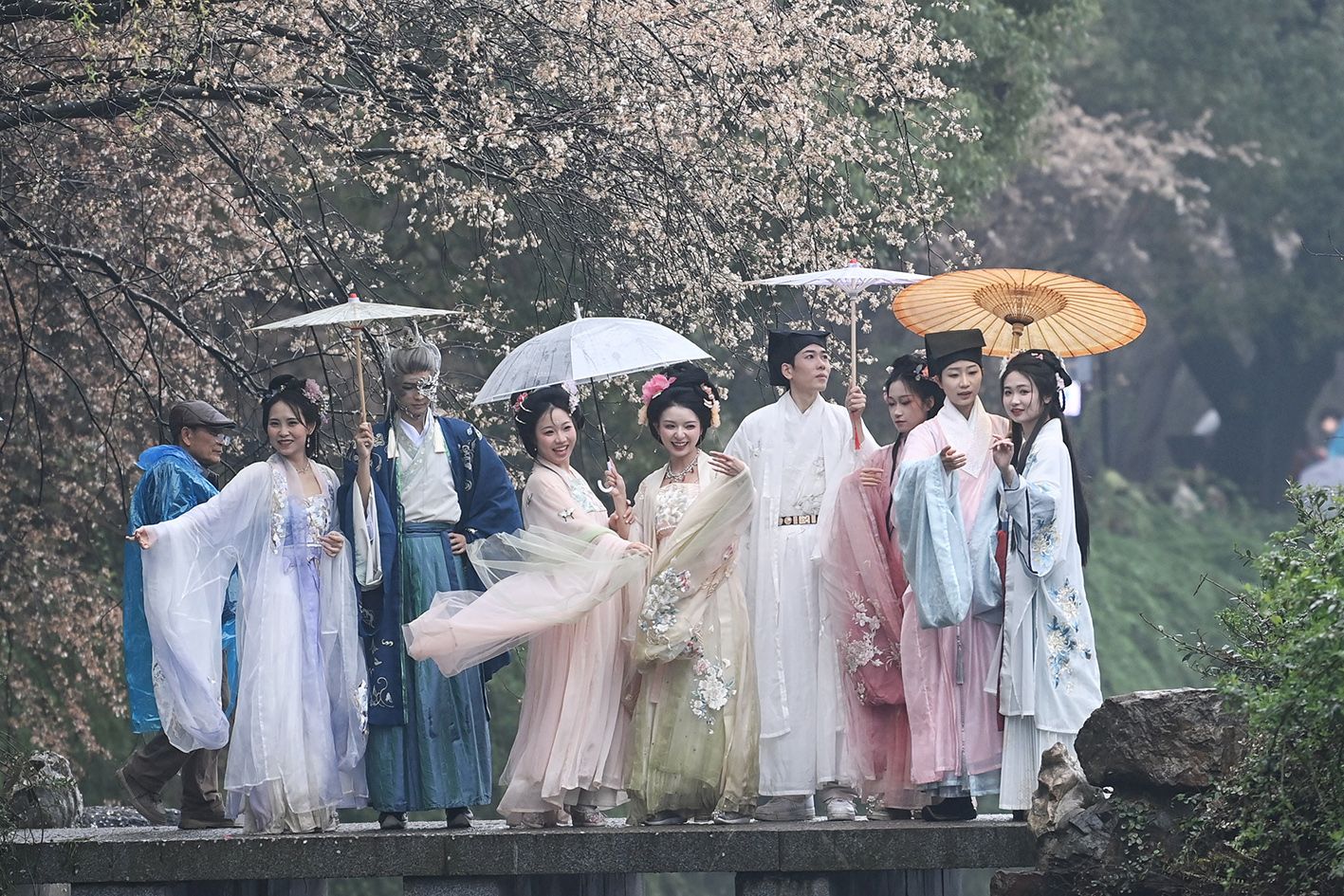 图为古装爱好者在樱花树下打卡拍照。(中新社)