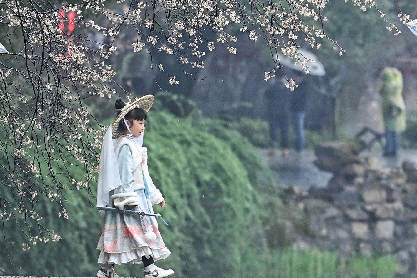 小女孩身着古装行走在樱花树下。(中新社)