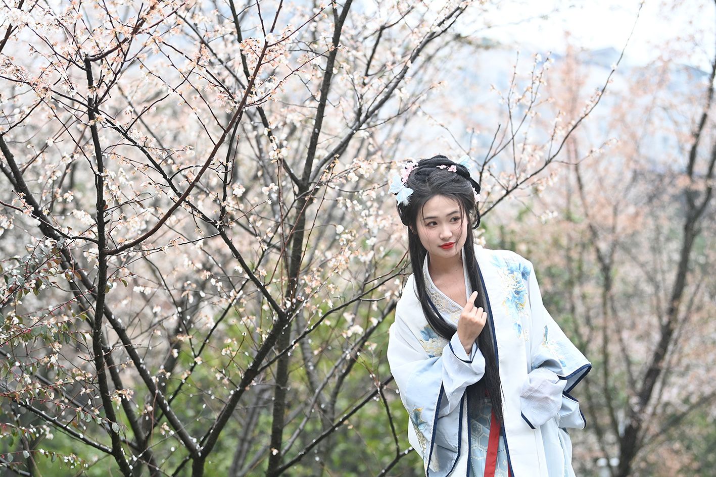 3月17日,长沙市望月公园举办“文润望月(甲辰)踏春赏樱季——早樱星语”活动,吸引众多古装爱好者身着古装游园,让市民在赏樱的同时,也能体验到国风潮流的魅力。(中新社)