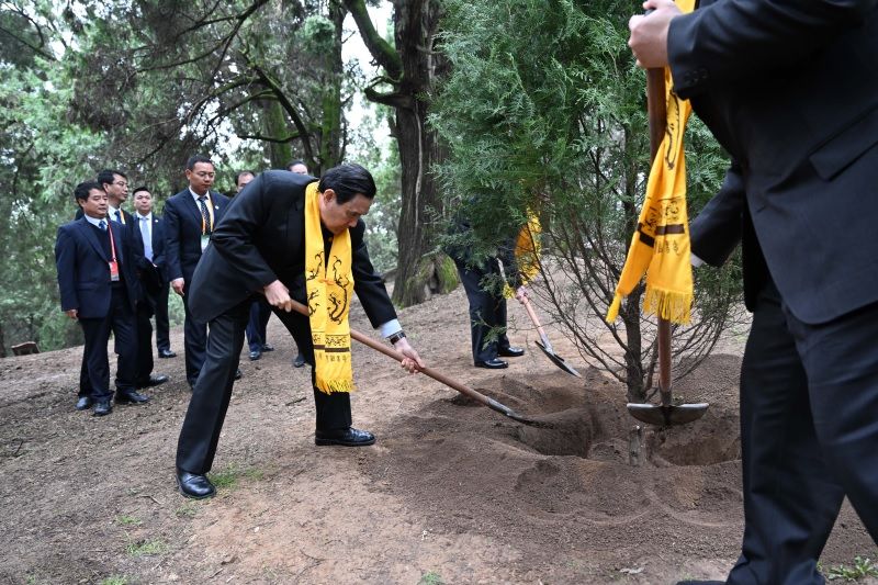 马英九在种植桥山柏。(图/中新社)