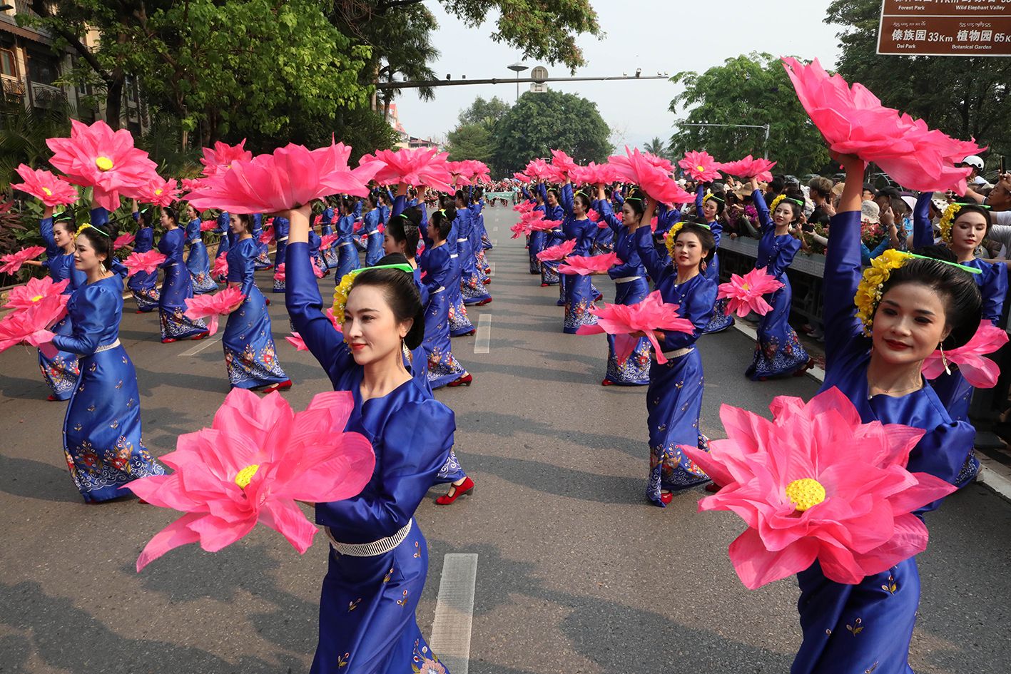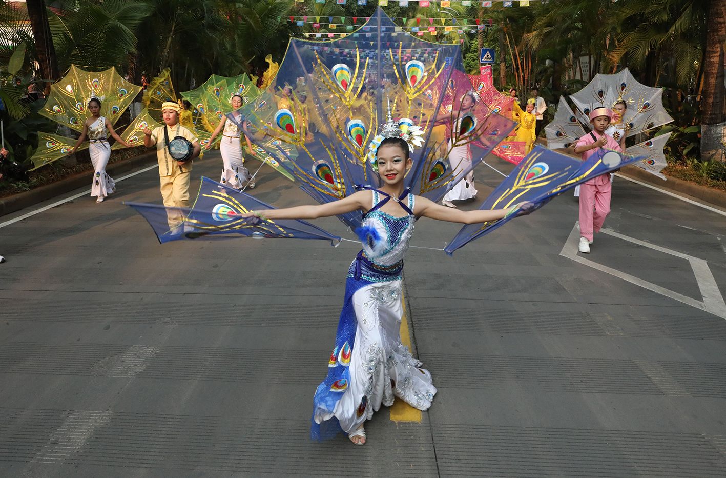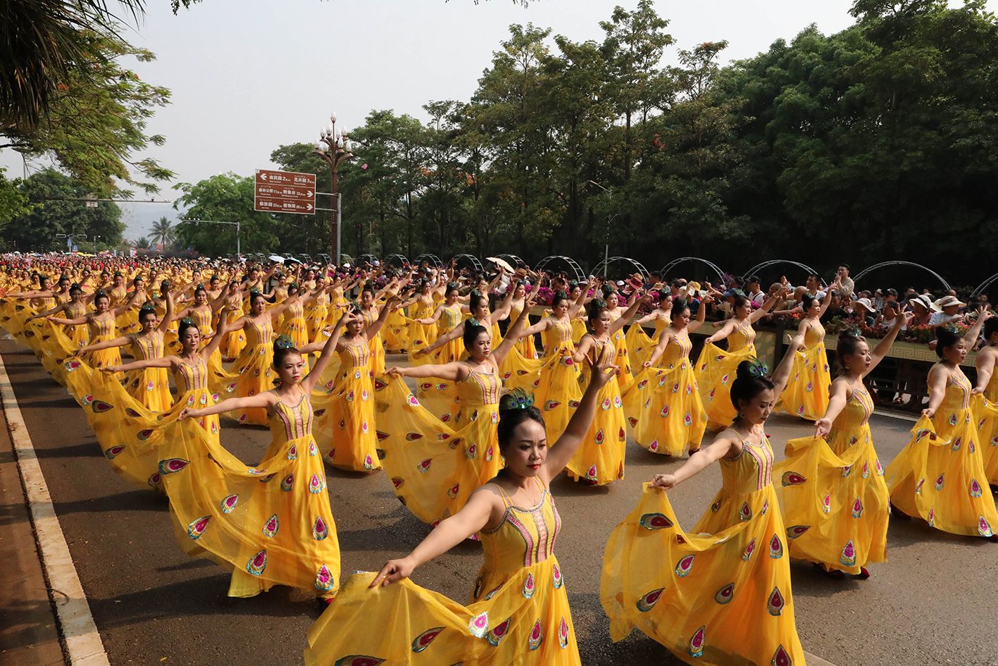 4月14日,云南省西双版纳傣族自治州在景洪市举办泼水节民族民间传统文化游演活动,各族群众代表身着节日盛装载歌载舞,向市民和游客展示了丰富多彩的少数民族传统文化。