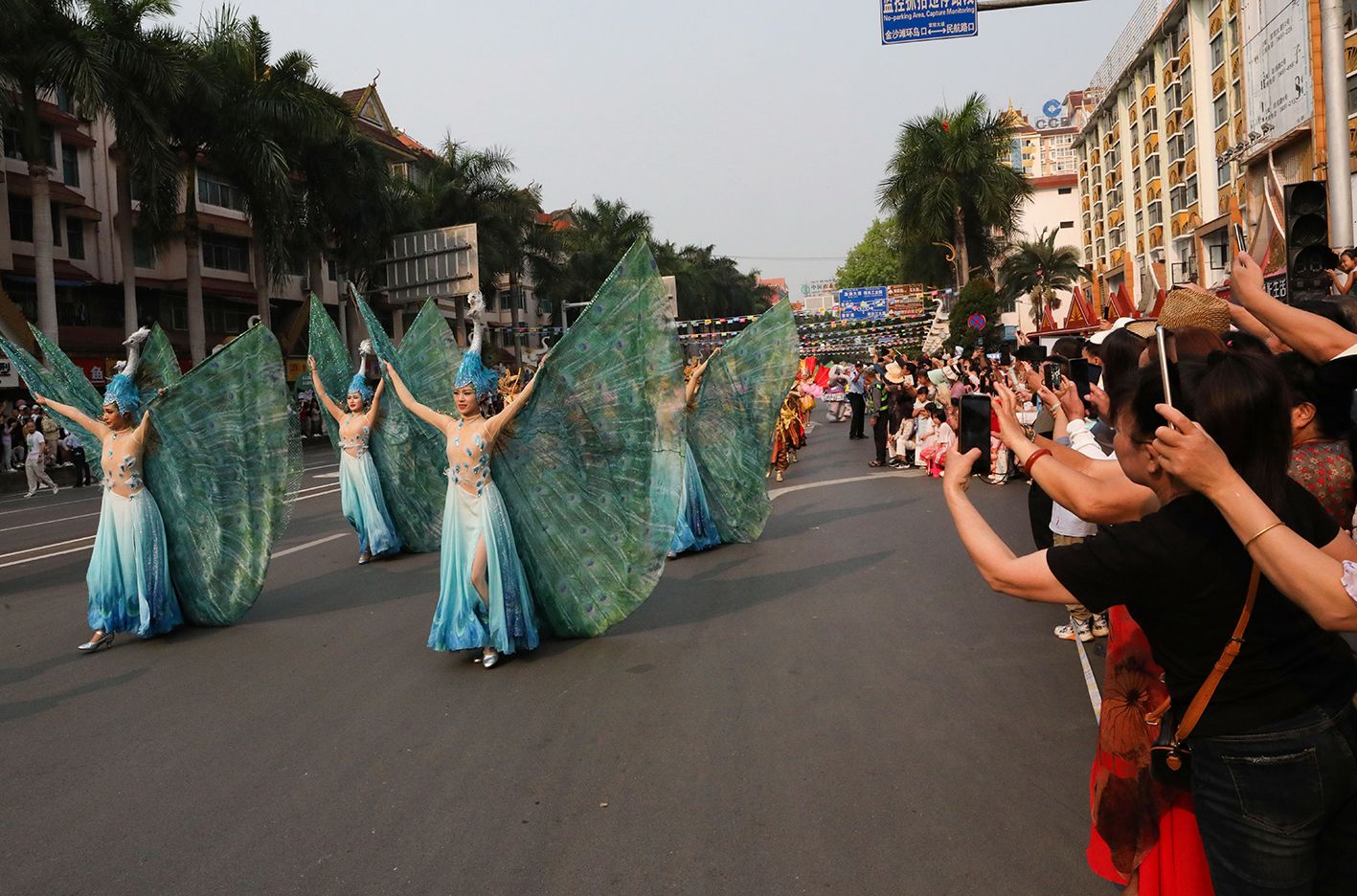 4月14日,民众代表在云南省景洪市参加民族民间传统文化游演。(中新社)