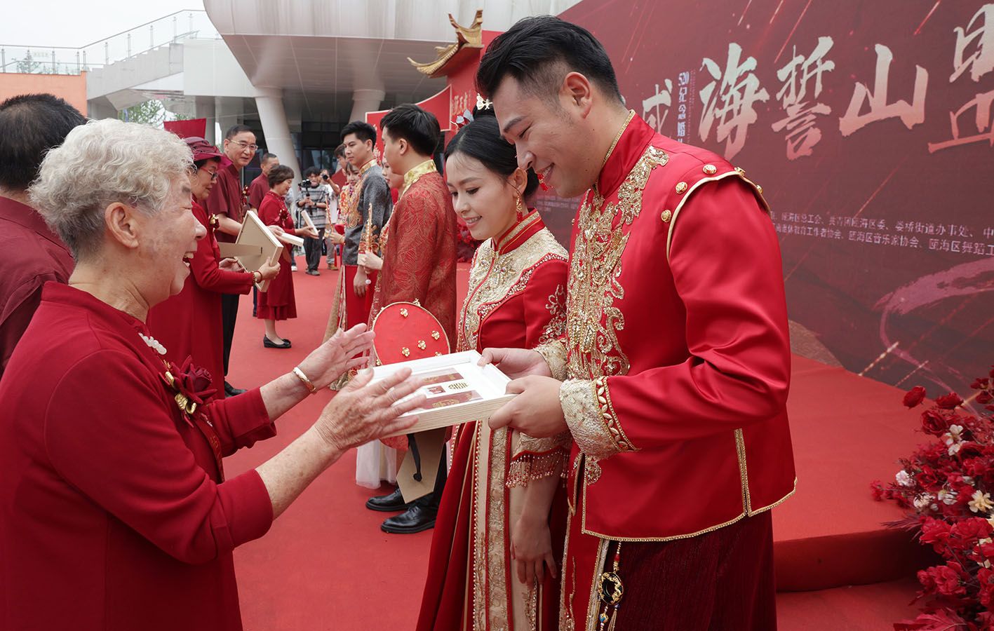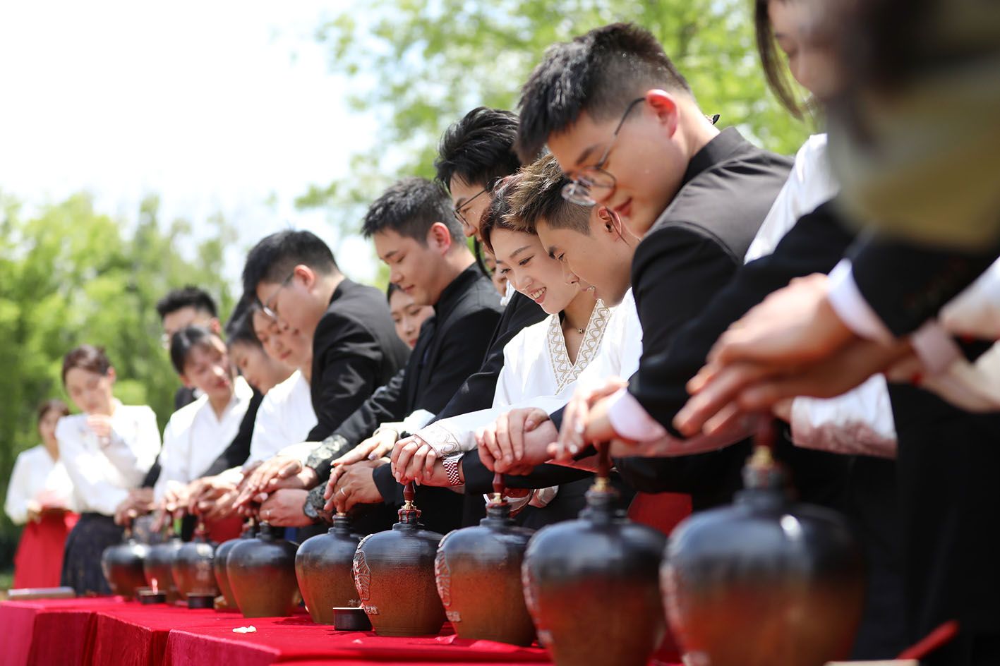 5月20日,在浙江省嘉兴市南湖区南湖天地婚姻登记颁证基地,新人们在集体婚礼上进行“封坛礼纳福”。(新华社)