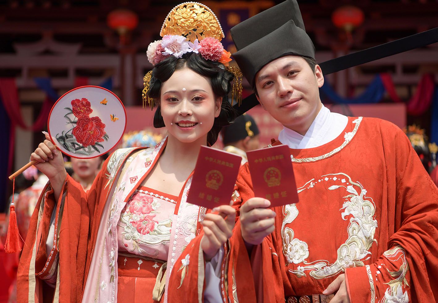 5月20日,在河南省洛阳市上阳宫,参加公益集体传统婚礼的一对新人展示自己的结婚证。(新华社)