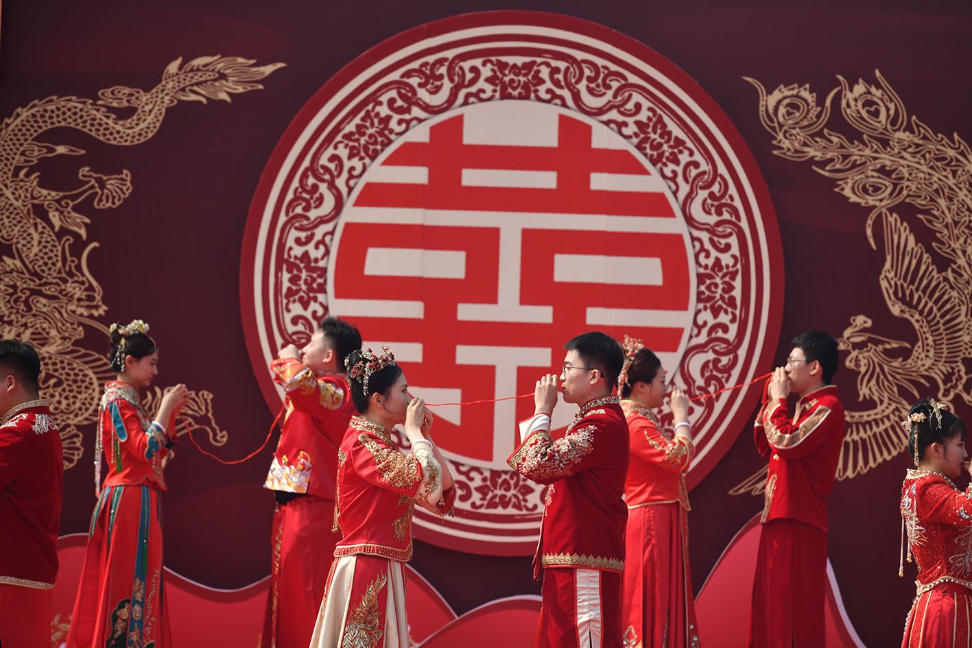 5月20日,在四川省南充市嘉陵江畔,身穿中式礼服的新人在集体婚礼上喜结良缘。(新华社)