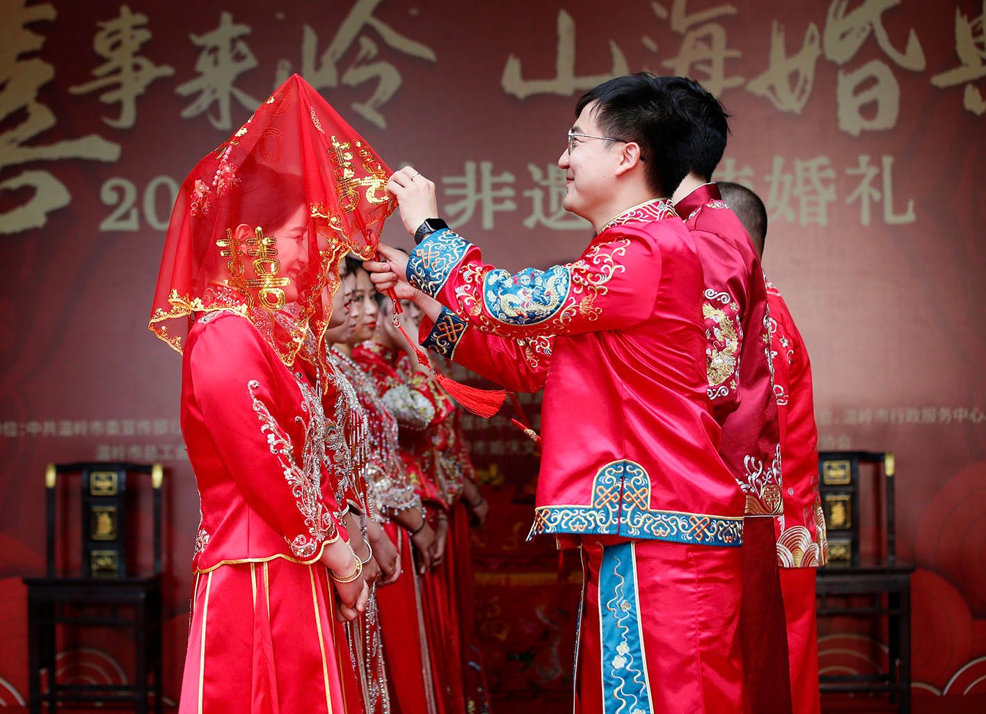5月20日,新人在浙江省温岭市非遗传统集体婚礼上。(新华社)