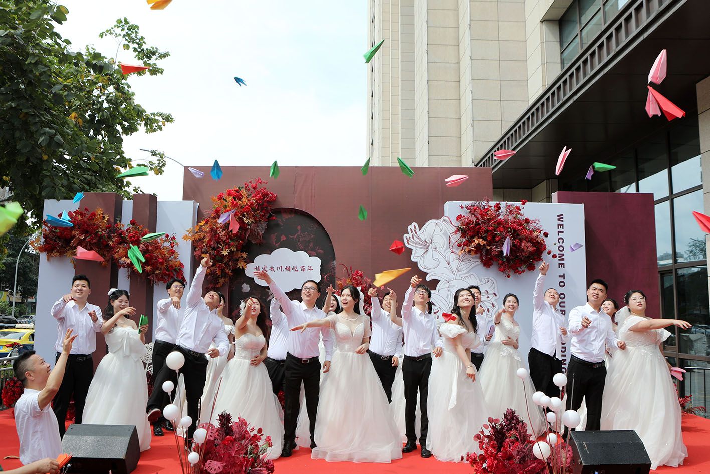 5月20日,新人在重庆市永川区集体婚礼上放飞纸飞机。(新华社)