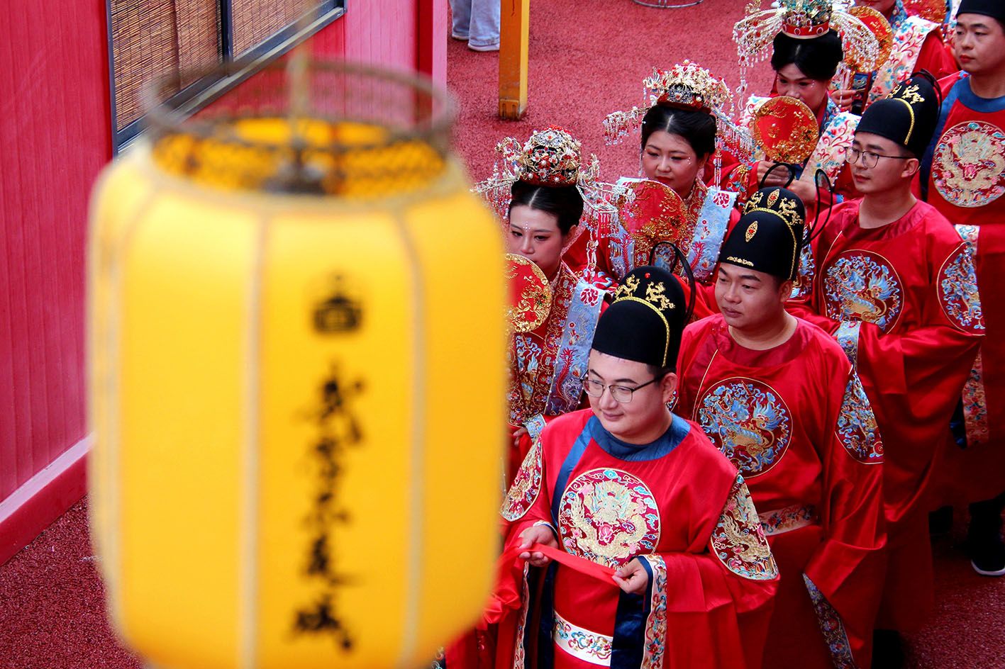 5月20日,在湖北省十堰市郧阳区武当不夜城,新人们参加集体婚礼。(新华社)