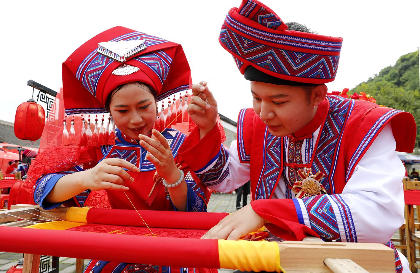 5月20日,在广西忻城县“520”集体婚礼现场,一对新人一起绣婚书。(新华社)