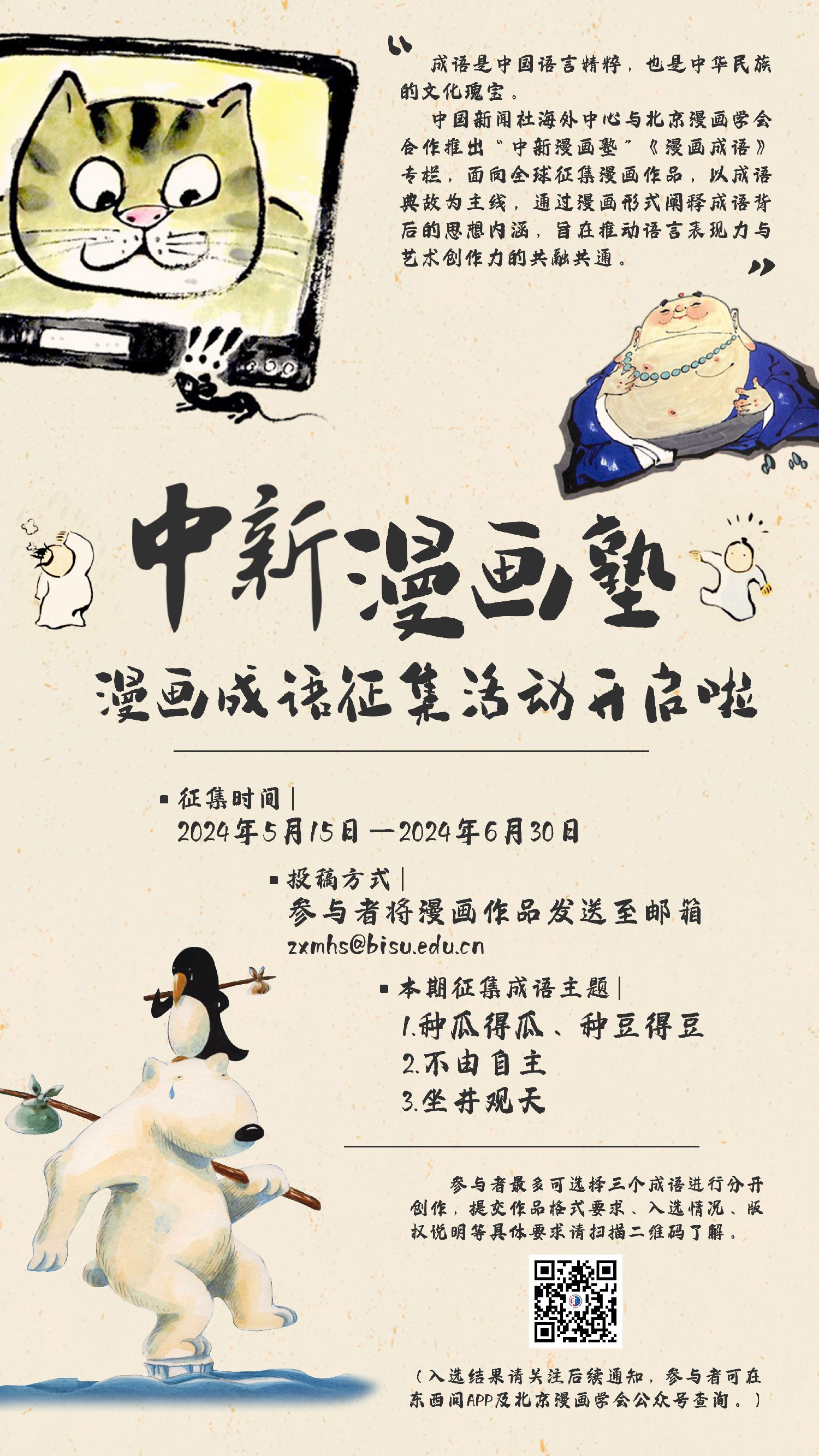 成语是中国语言精粹,也是中华民族的文化瑰宝。熟知每一个成语,不仅可以培养语言能力,也有助于加深对传统文化的理解。中国新闻社海外中心与北京漫画学会合作推出“中新漫画塾”《漫画成语》专栏,现面向全球征集漫画作品。