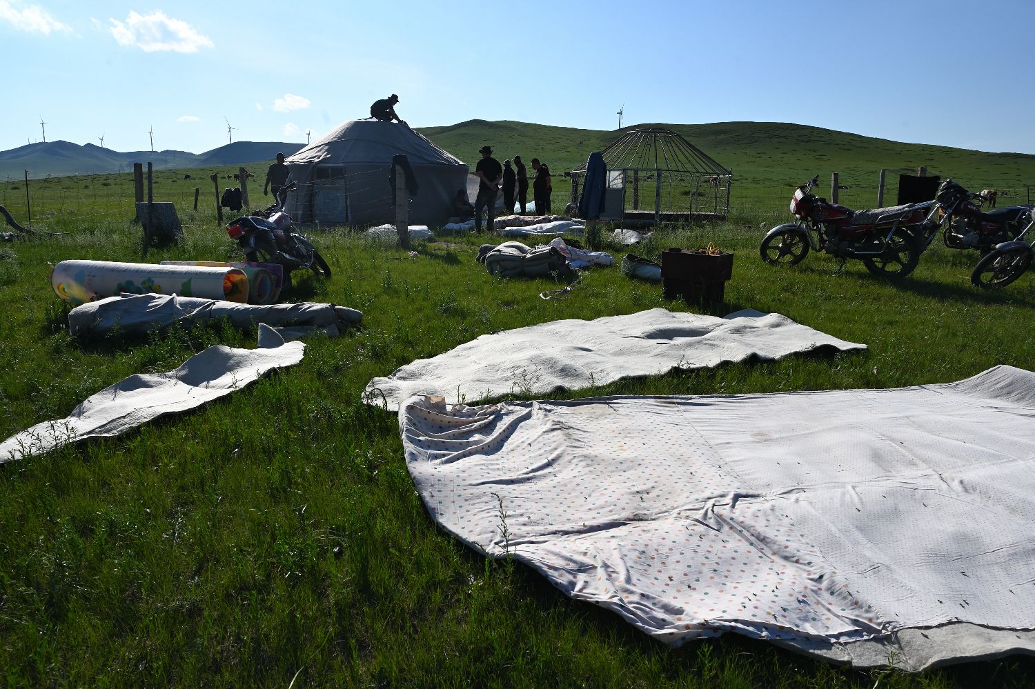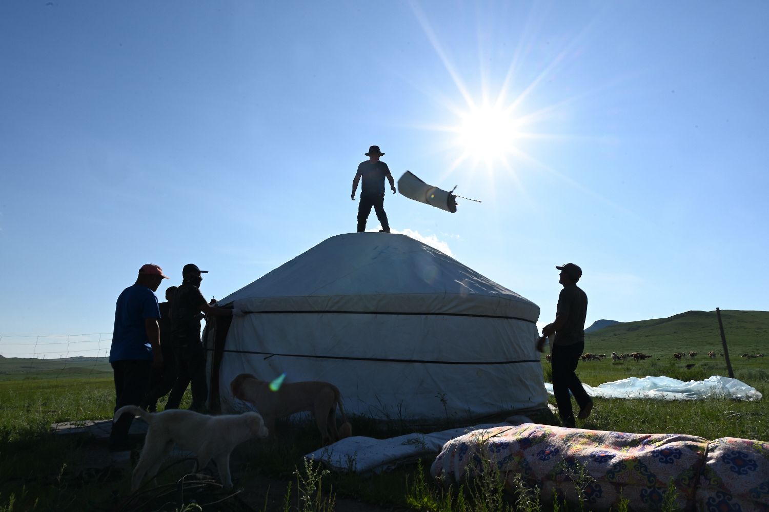 6月17日,在内蒙古通辽市扎鲁特旗格日朝鲁苏木,牧民那仁达来一家经过两天半跋涉,到达夏牧场,搭起蒙古包,准备在这里长住4个月。图为那仁达来站在蒙古包顶,准备铺毛毡。(中新社)