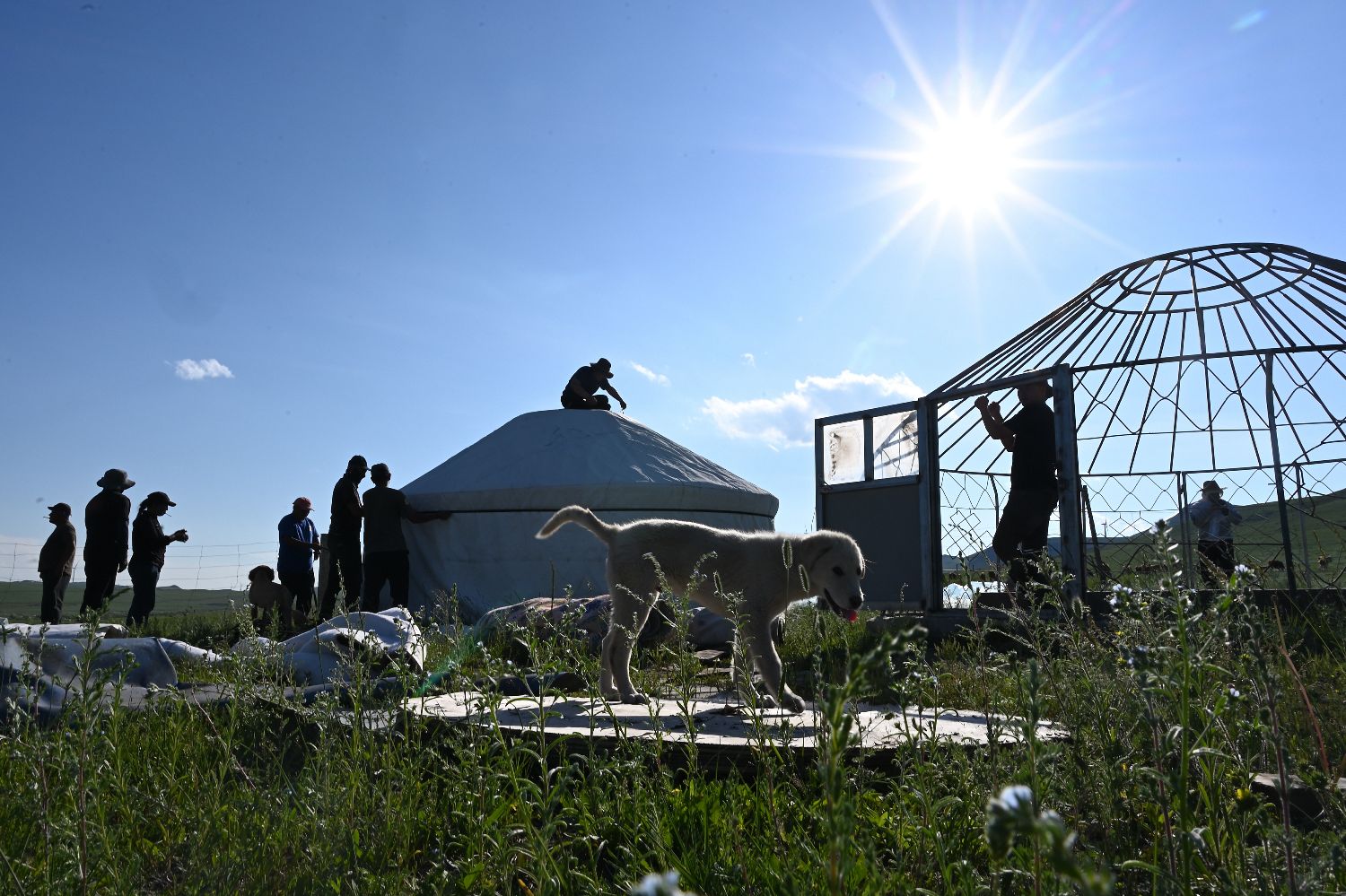 6月17日,在内蒙古通辽市扎鲁特旗格日朝鲁苏木,牧民那仁达来一家经过两天半跋涉,到达夏牧场,搭起蒙古包,准备在这里长住4个月。