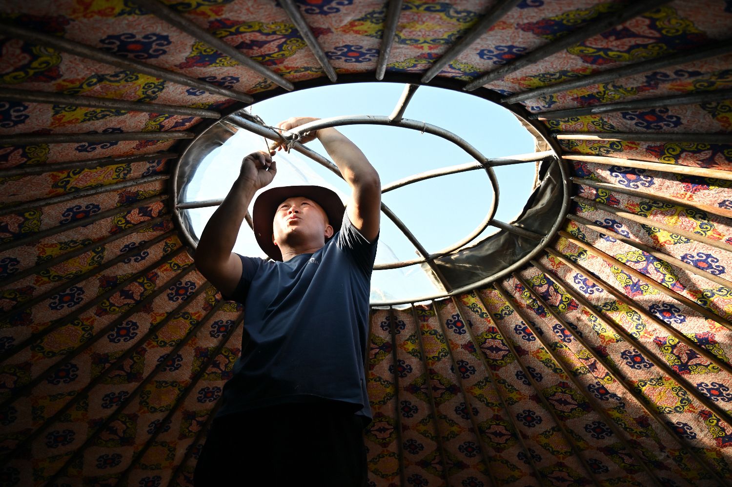 那仁达来坐在包顶和朋友们一起搭蒙古包,现在大多数蒙古包骨架用铁替代木头,更加坚固、耐用。(中新社)