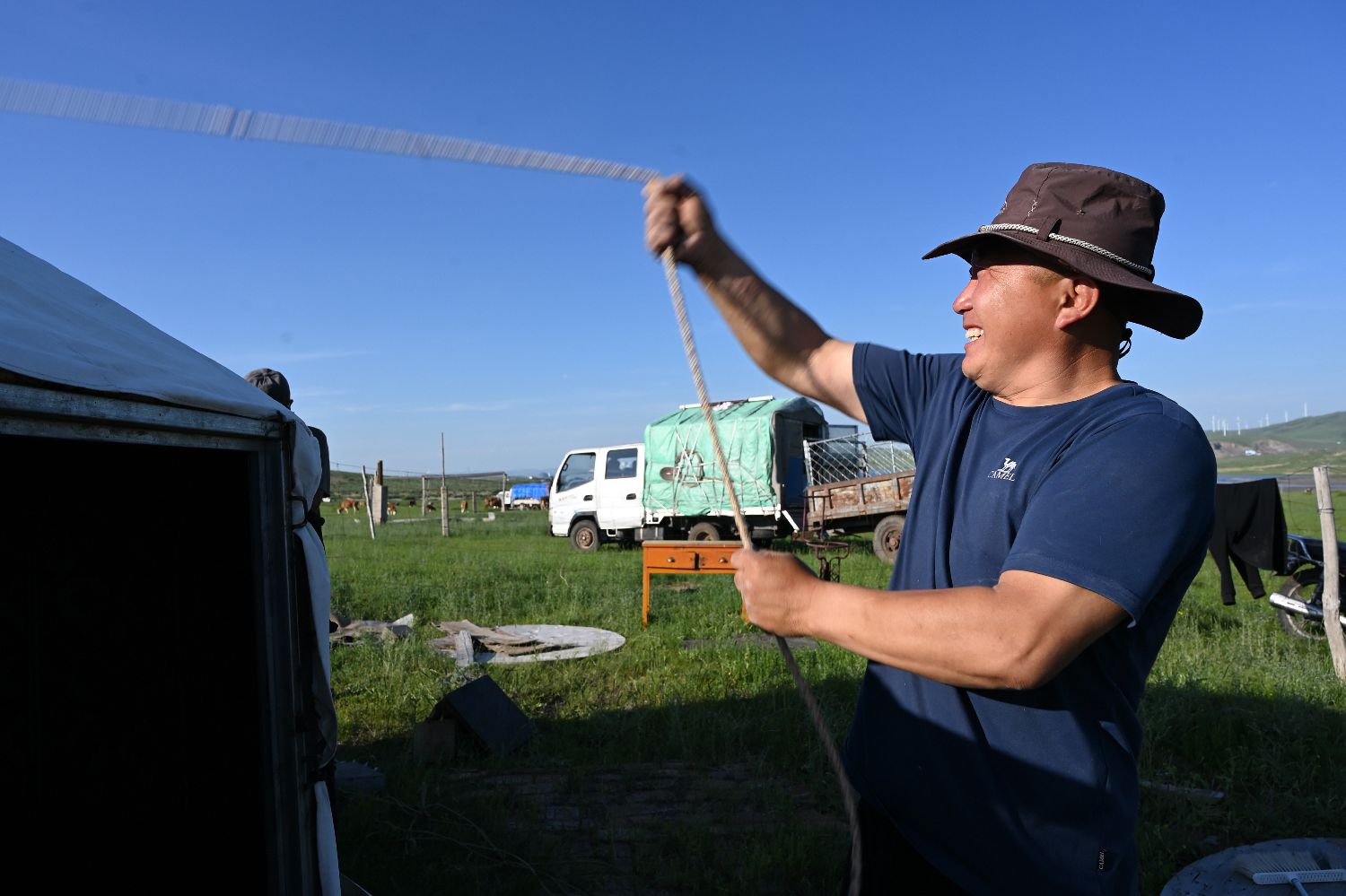 仁达来用绳子把蒙古包勒紧,然后固定在草地上。(中新社)