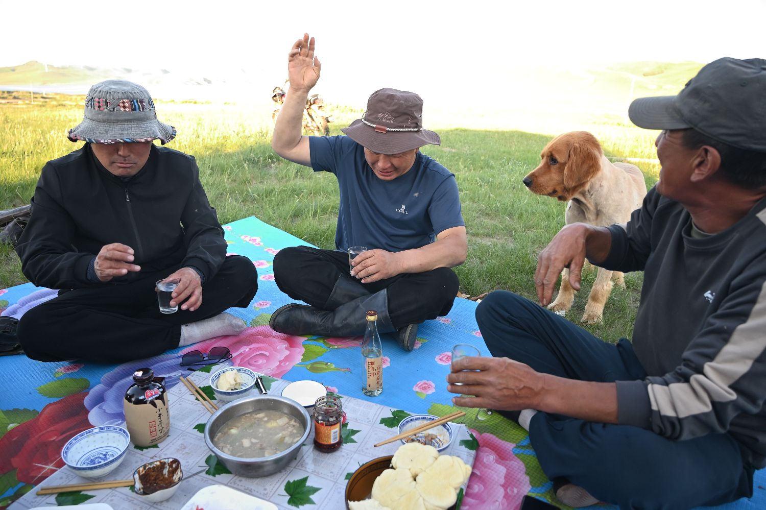 那仁达来在邻居家享用到营地的第一餐。图为就餐前用酒敬天仪式。按照传统,先到营地的牧民会做好餐食欢迎后来的牧民。(中新社)