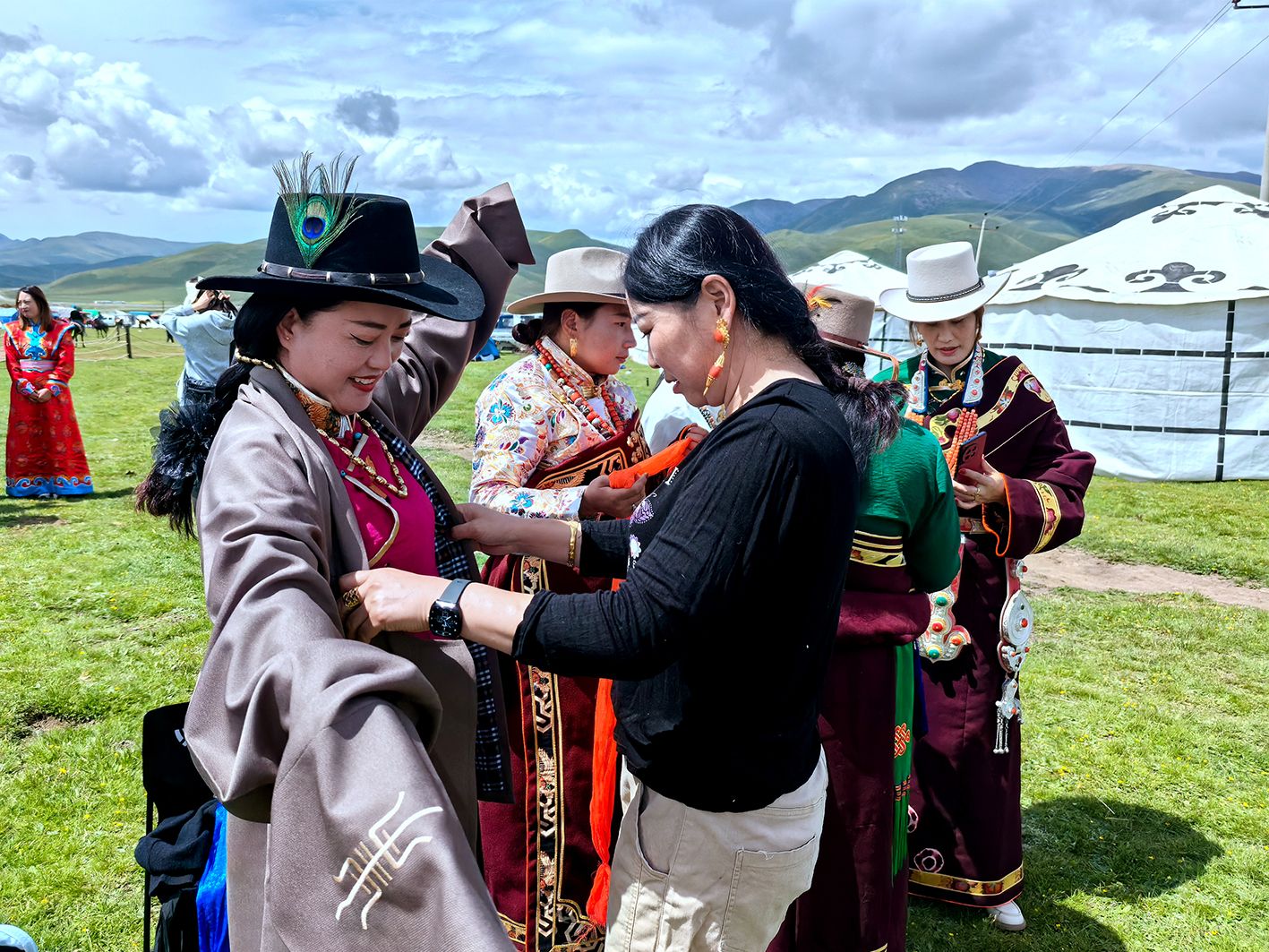 除了举办摔跤、射箭、赛马等那达慕传统活动外,活动还展示和销售地方美食、民族特色生产生活用品、非遗手工艺品等,丰富多样的“文旅大餐”让与会民众应接不暇。图为民众着盛装参加活动。(中新社)