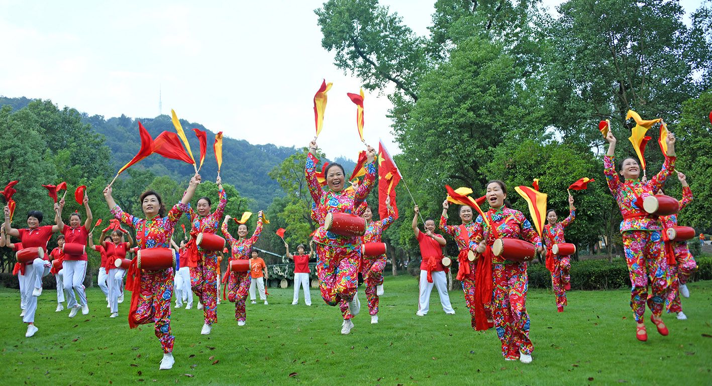 9月30日,浙江省台州市仙居县南峰街道湿地公园,社区居民打起欢乐的腰鼓喜迎国庆。国庆节临近,中国各地开展丰富多彩的民俗活动,表达对中国的美好祝愿,喜迎国庆节。(CFP)