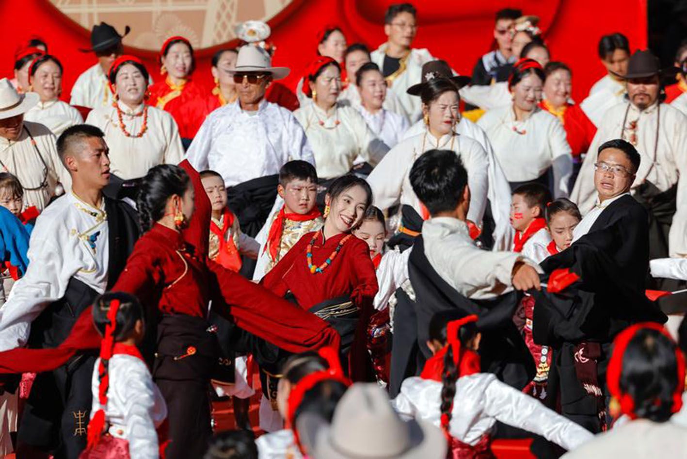 9月29日,在道孚县音乐广场,人们身着节日盛装跳锅庄舞。当日,四川省甘孜藏族自治州道孚县举办“花开道孚庆华诞·同心共筑中国梦”庆祝中华人民共和国成立75周年活动,各族各界干部群众代表欢聚一堂,共跳民族团结锅庄舞,喜迎国庆。(新华社)