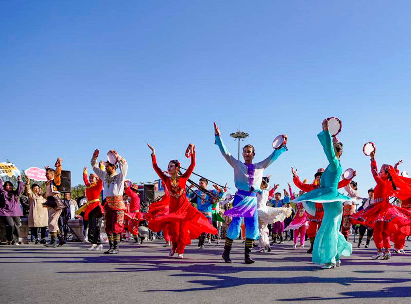 9月29日,在乌鲁木齐地窝堡国际机场T3航站楼外广场上,乌鲁木齐市艺术剧院演员进行民族歌舞表演。(新华社)