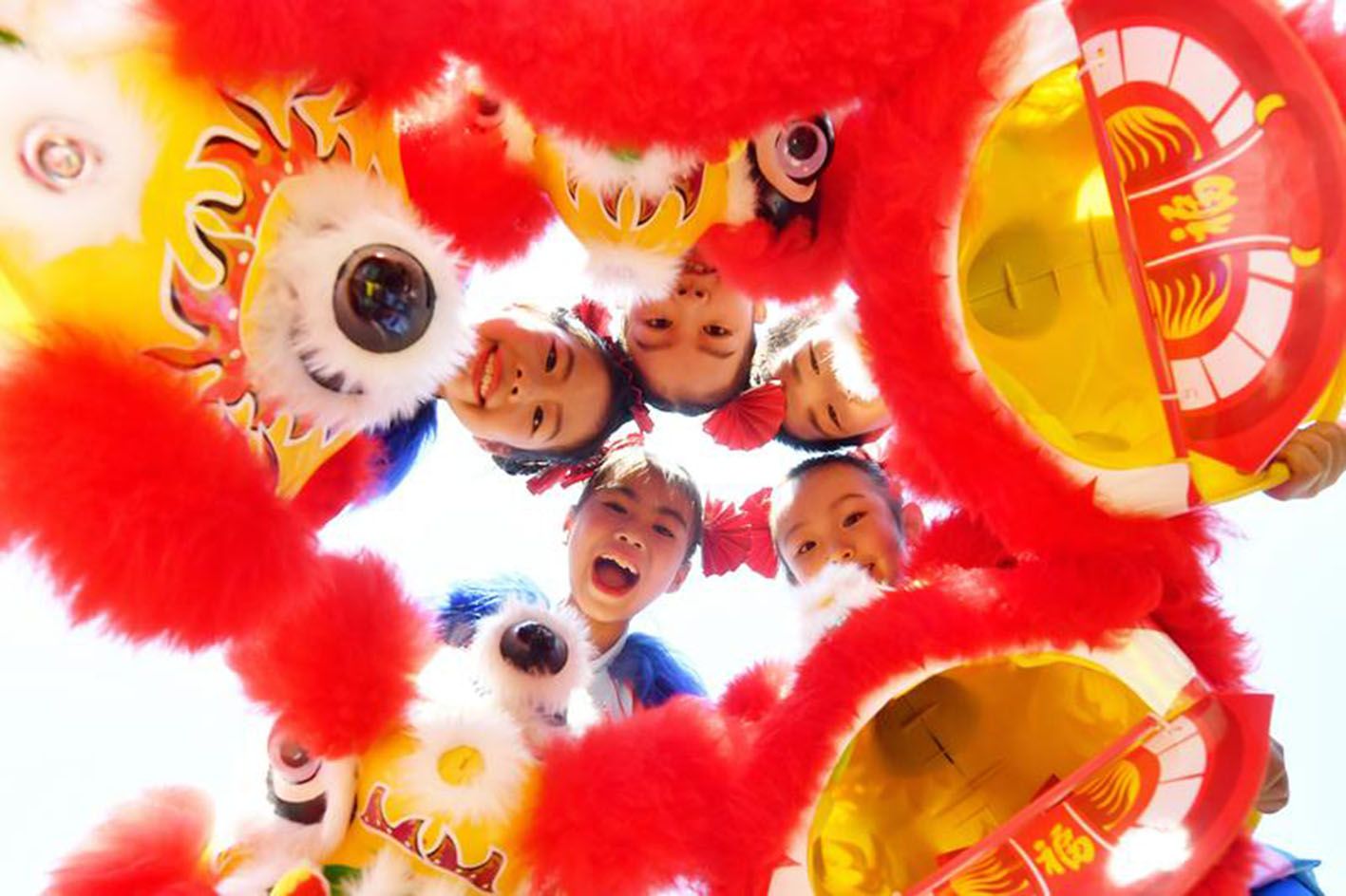 9月27日,在山东青岛北仲路第一小学开展的国庆主题系列活动上,小学生在表演狮子舞。(新华社)