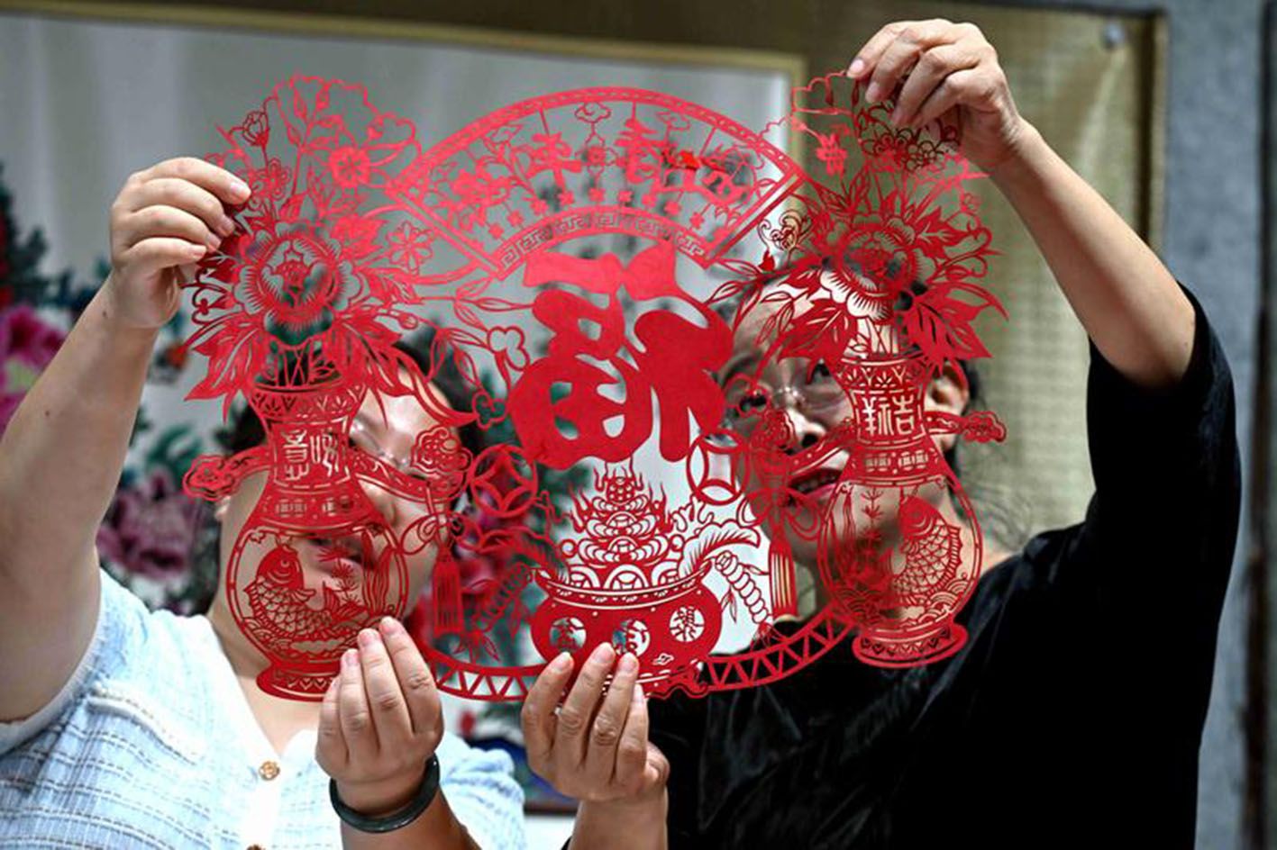 9月27日,河北省石家庄市蔚县剪纸国家级代表性传承人周淑英(右)在“展非遗 迎国庆”系列主题活动中展示剪纸作品。(新华社)