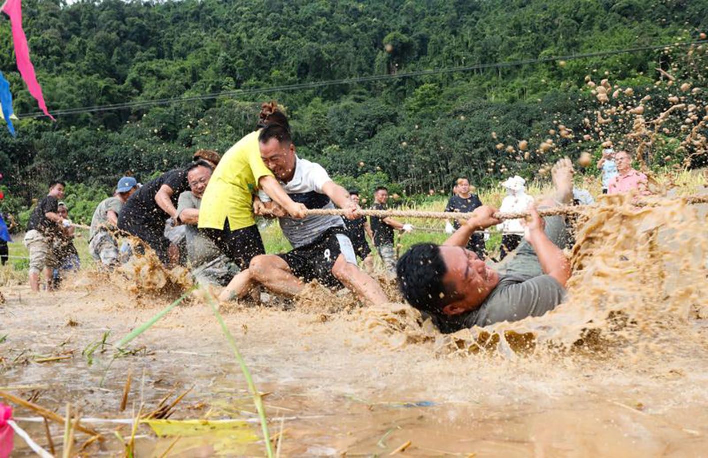 9月28日,云南省勐腊县关累镇曼丢村的村民在该村的迎国庆水田拔河比赛中奋勇拼搏。(新华社)