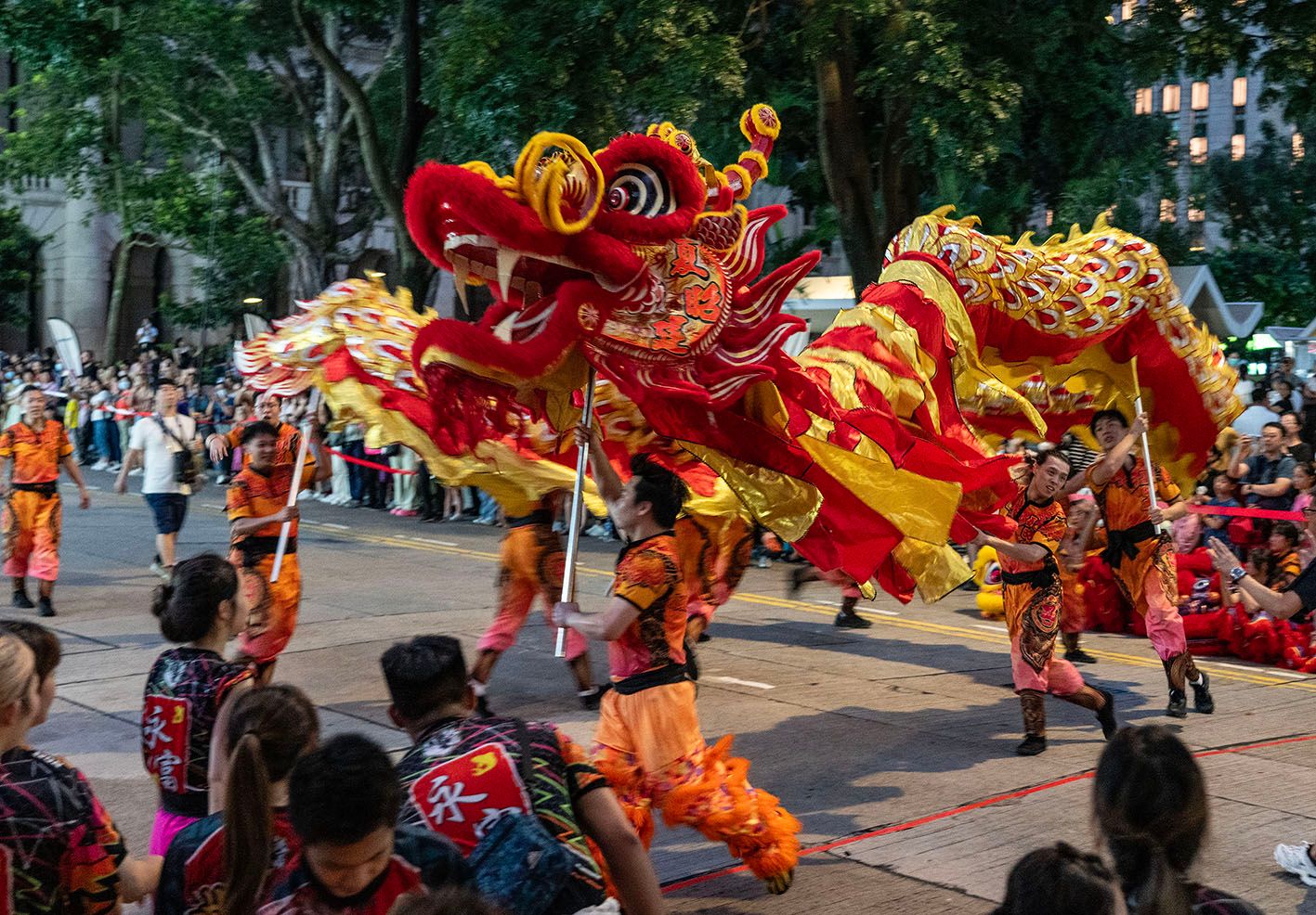 当地时间9月29日晚,为迎接新中国成立75周年,“中华龙狮大汇演”活动在香港中环举行,8条舞龙和75只舞狮同场演出,营造出热烈的庆祝氛围。图为中环街头舞龙表演。(中新社)
