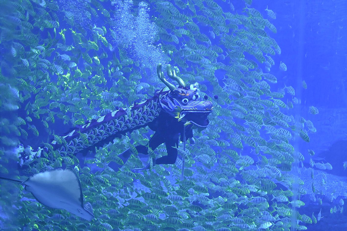 9月29日,湖南长沙湘江欢乐海洋公园的潜水员带着标语与龙头潜入池中,将中国舞龙与潜水技能结合,进行水下舞龙表演,庆祝即将到来的国庆节。图为潜水员在水下舞龙穿过鱼群。(中新社)