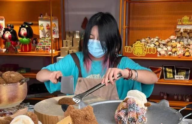 近日,山西太原钟楼街附近出现一批吆喝叫卖“刀削面”的摊主,手里拿的并不是发酵好的面团,而是一团软乎乎的毛绒玩具“刀小面”。而摊主则会当着顾客的面,在毛绒团上“削”几下,然后按照顾客的需求,从面前的碗里依次挑选“肉片”“鸡蛋”和“蔬菜叶”作为配菜——当然,他们也同样是毛绒制品,摊主现场为大家展示沉浸式售卖现场。(不止喜跃PlushParty小红书)