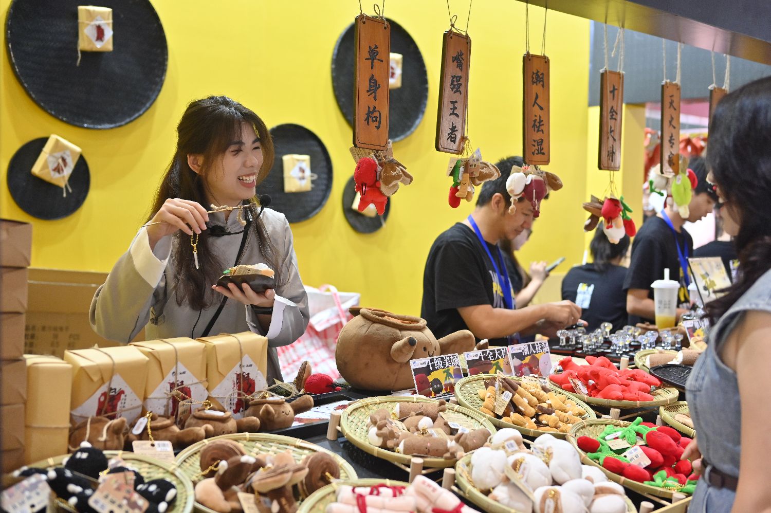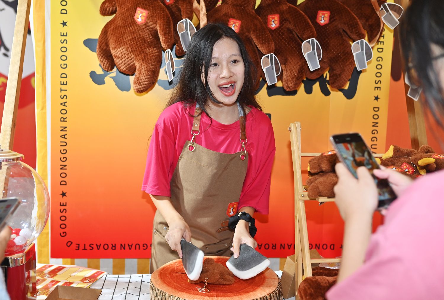10月24日,第十四届中国国际影视动漫版权保护和贸易博览会在广东东莞举行,展会现场一位年轻人在烧鹅毛绒玩具摊位前“享用”东莞特色美食“烧鹅濑粉”。(中新社)