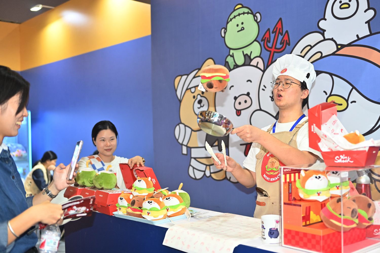 10月24日,第十四届中国国际影视动漫版权保护和贸易博览会在广东东莞举行,展会现场的工作人员为顾客“加热”汉堡毛绒玩具。(中新社)