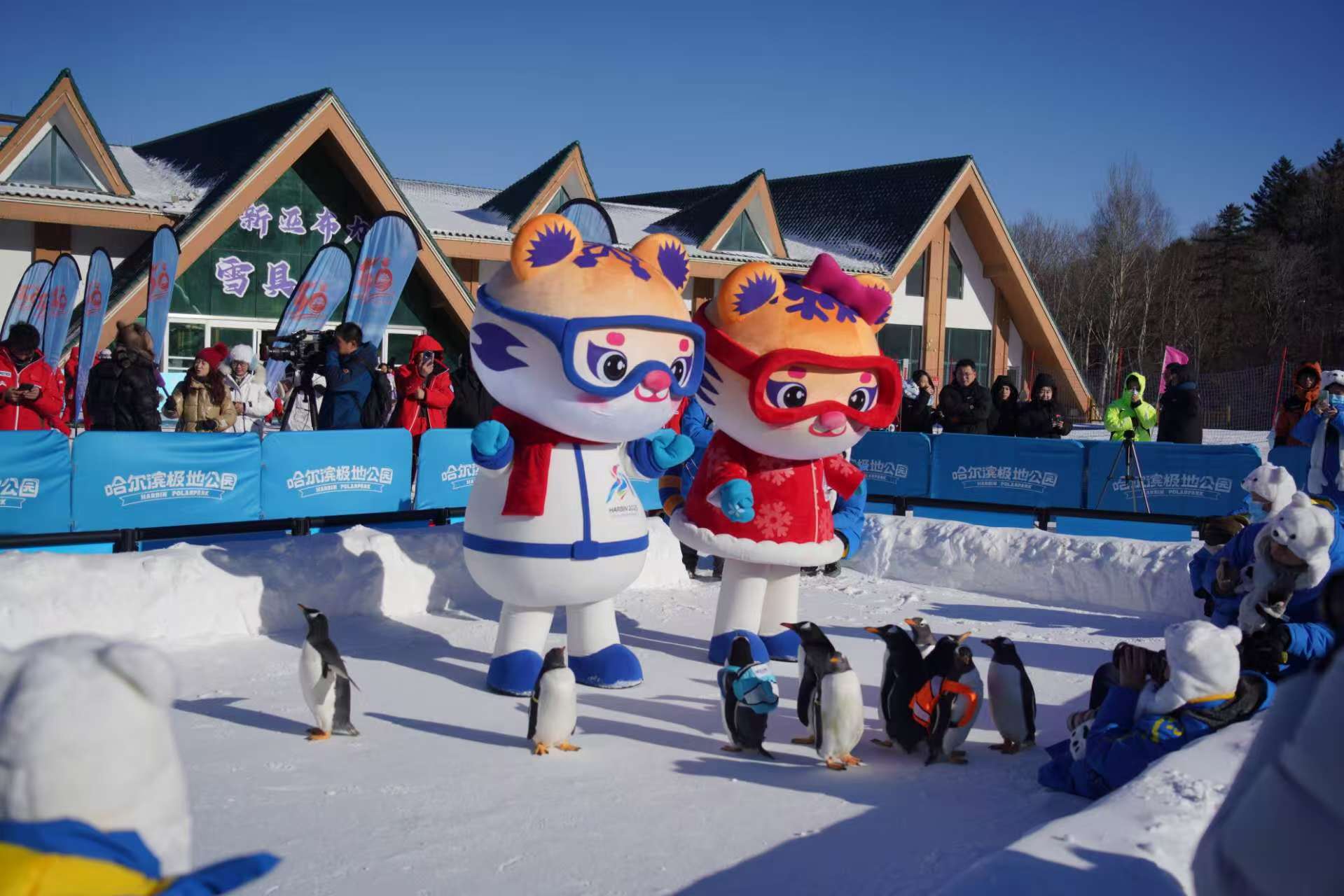 12月12日,哈尔滨亚布力,第22届亚布力滑雪节暨亚布力滑雪旅游度假区50周年庆典活动启幕现场,哈尔滨极地公园的“淘学企鹅”与亚冬会吉祥物“滨滨”“妮妮”一同亮相。(图/中新社)