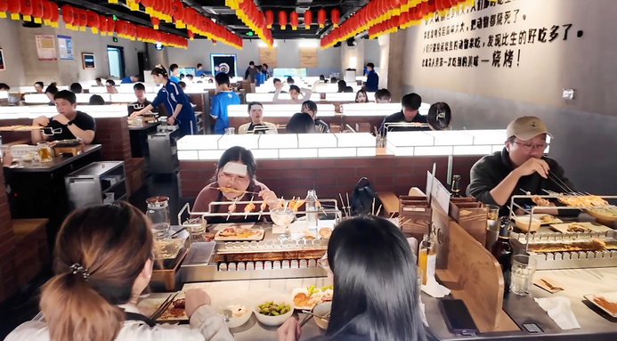 12月27日,在位于上海第一百货商场的“很久以前”烧烤店里,一半以上的顾客说着韩语,不少人额头上还贴着退热贴,据说是效仿某位来此旅游打卡的韩国艺人而特有的装扮。(图/中新社)