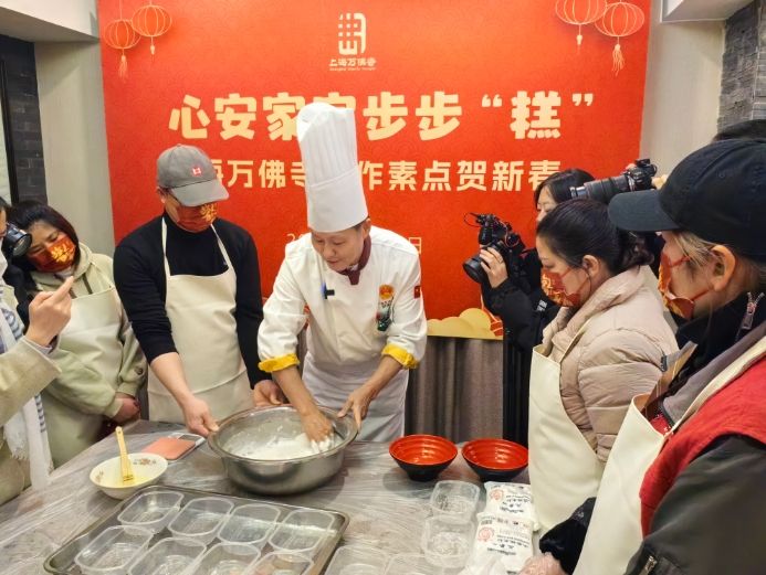 1月23日,上海万佛寺举行手作素点贺新春活动,中式面点高级技师邓修青(右一)指导当地居民制作桂花糕。(图/中新社)