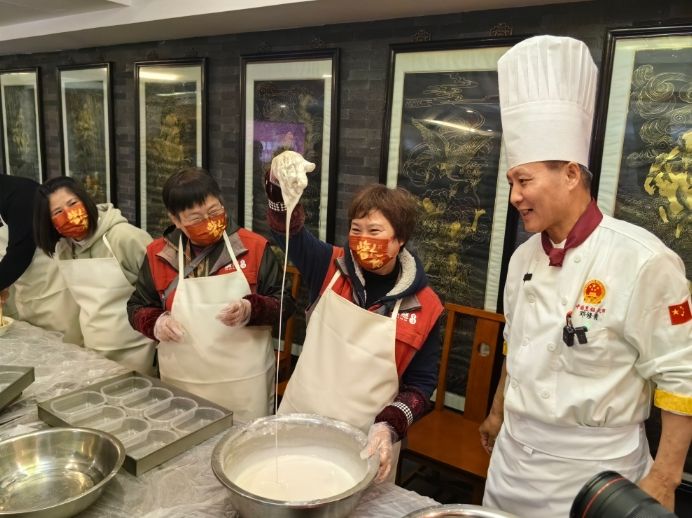 当日恰逢南方小年,当地居民和志愿者相聚一堂过小年。桂花糕被誉为“江南甜点之冠”,“糕”谐音“高”,“新年吃糕步步高”是老上海人记忆中不可或缺的年俗。
