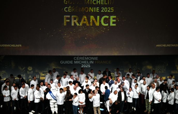 当地时间3月31日,2025年《米其林指南》法国版在法国东北部城市梅斯面世。2025年法国版指南新增68家星级餐馆,这些餐馆的厨师和经营者在当天举行的仪式上集体合影。(图/中新社)
