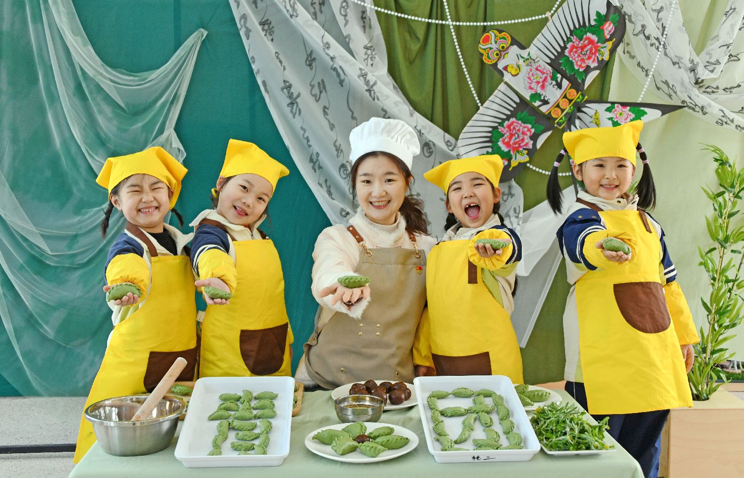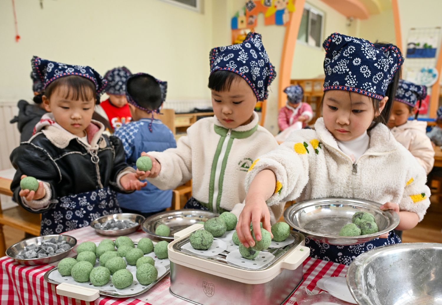 4月2日,福建省福州市鼓楼区水部街道延安幼儿园,老师正在指导孩子体验做青团习俗。(CFP)