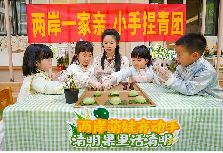 清明至,青团香。4月4日是中国二十四节气之一清明节,一个充满哀思与缅怀的节日,青团作为其传统食品之一,承载着深厚的文化内涵。传统青团的外表呈现出青绿色,象征着生命、希望和新的开始。每逢清明,中国各地的人们通过吃青团来表达对逝去亲人的思念和缅怀,希望他们在天堂过得平安、幸福。在这个特殊的日子里,让我们一起吃一口青团,感受那份深沉的思念与敬畏之情吧。图为4月1日,浙江省台州市仙居县迎晖幼儿园的孩子们跟着老师学做青团,感受传统习俗文化。(CFP)