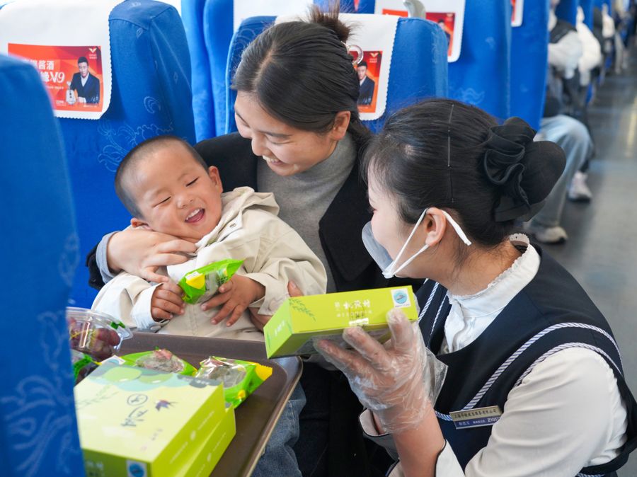 为丰富旅客旅途体验,中国铁路上海局集团公司华铁旅服公司近日在长三角热门旅游线路的56趟高铁列车上,推出“春季限定”主题餐食服务,让旅客在旅途中感受“舌尖上的春天”。此次推出的主打产品是长三角传统时令青团,包含红豆沙、黑芝麻、蛋黄肉松三种经典口味。据相关负责人介绍,这些青团选用新鲜艾草汁和面,外皮软糯清香。馅料制作工艺讲究:蛋黄肉松青团选用知名产地咸蛋黄与上等肉松,咸香浓郁;黑芝麻青团通过低温烘焙工艺,充分激发芝麻醇香;红豆沙青团则采用古法研磨,细腻清甜。图为餐饮乘务员在车厢里为旅客介绍时令新品。(中新网)