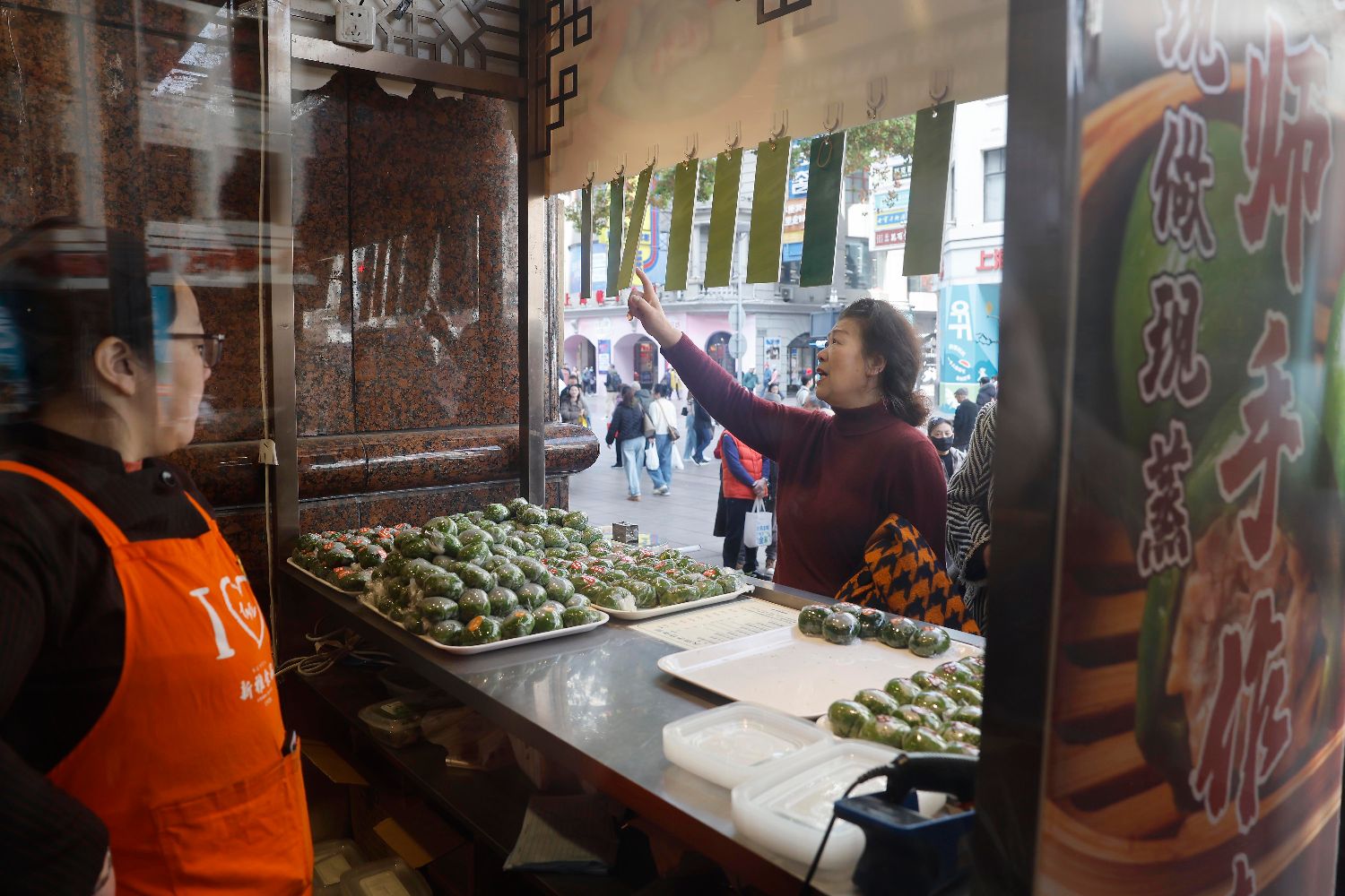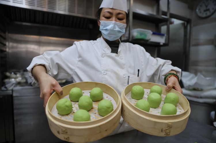 清明将至,上海多家老字号的青团又开始起蓬头了,杏花楼、沈大成、功德林、王家沙……但凡出品“青墩墩”的老字号门前都是一条条长龙。每年的青团季,新品都是要拿出来比拼的。今年市场上的新品不少,沈大成研发出春三鲜青团、叮咚买菜上新茉莉轻芽青团、德兴馆推出能裹住一只大虾的青团、功德林新添了鲜笋烤麸和椰香紫薯口味……看得到的时令、看得见的食材,是本季清明“限定美食”青团的趋势,也是青团走向更健康的符号。图为功德林点心师傅正在制作青团。(上观新闻网)