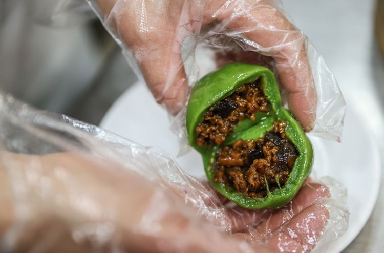 图为功德林新鲜出炉又翠绿油亮的鲜笋烤麸青团让人垂涎欲滴。脆爽的春笋配上功德林的招牌烤麸,咸甜软糯的口感在口腔中咀嚼出美妙滋味。(上观新闻网)