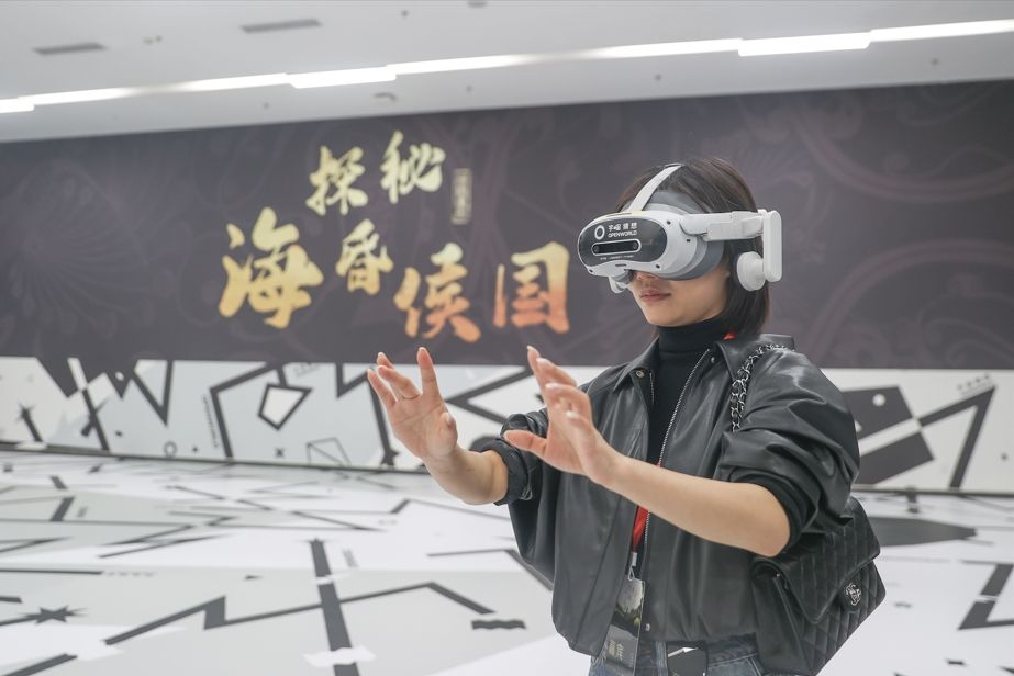4月2日,市民通过佩戴VR设备体验“探秘海昏侯国”数字沉浸特展。当日,“探秘海昏侯国”数字沉浸特展在江西南昌汉代海昏侯国遗址博物馆开展,该展以“穿越时空”为主线,通过剧情化叙事串联时空,依托VR、AR、空间定位等前沿技术,构建起一座“可游、可触、可感”的虚拟历史博物馆。(图/中新社)