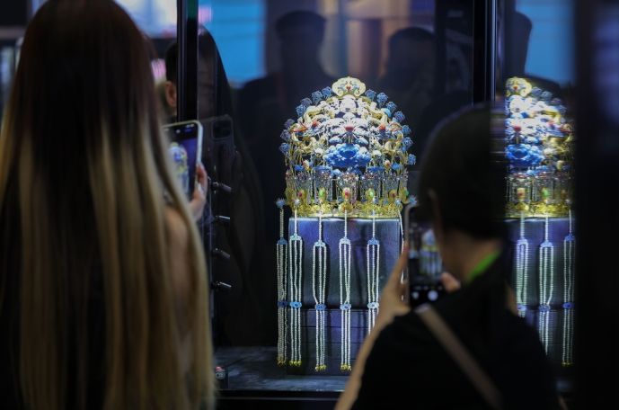 4月13日,海南海口,“非遗凤冠”亮相第五届中国国际消费品博览会,吸引参观者。 (图/中新社)
