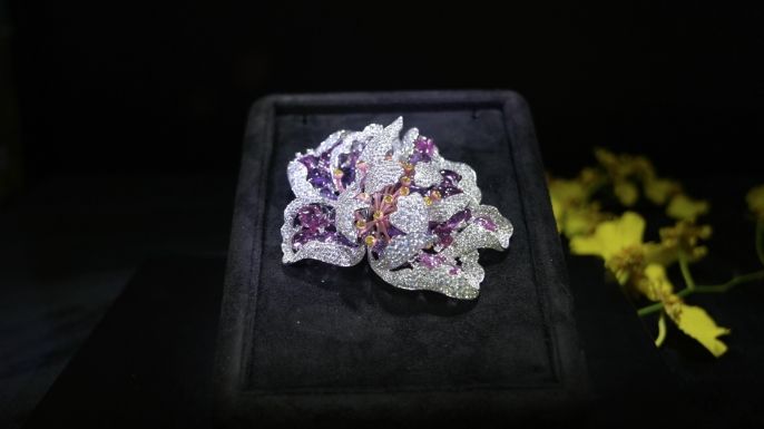 LARWINER艺术珠宝品牌总监黄奕轩介绍说,该胸针的灵感源自清代宫廷画家郎世宁的中国画作品《仙萼长春图册》,由1508粒天然钻石和79.02克拉天然蓝宝石、历时近半年打造而成,珠宝镶嵌工艺难度高。