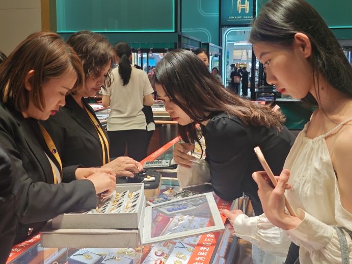 中国珠宝首饰进出口股份有限公司首次参展消博会,融合了“大足石刻”“只此青绿”等文化IP的珠宝产品亮相现场,展台前观展者络绎不绝,不少人看中新品便立马下单预定。
