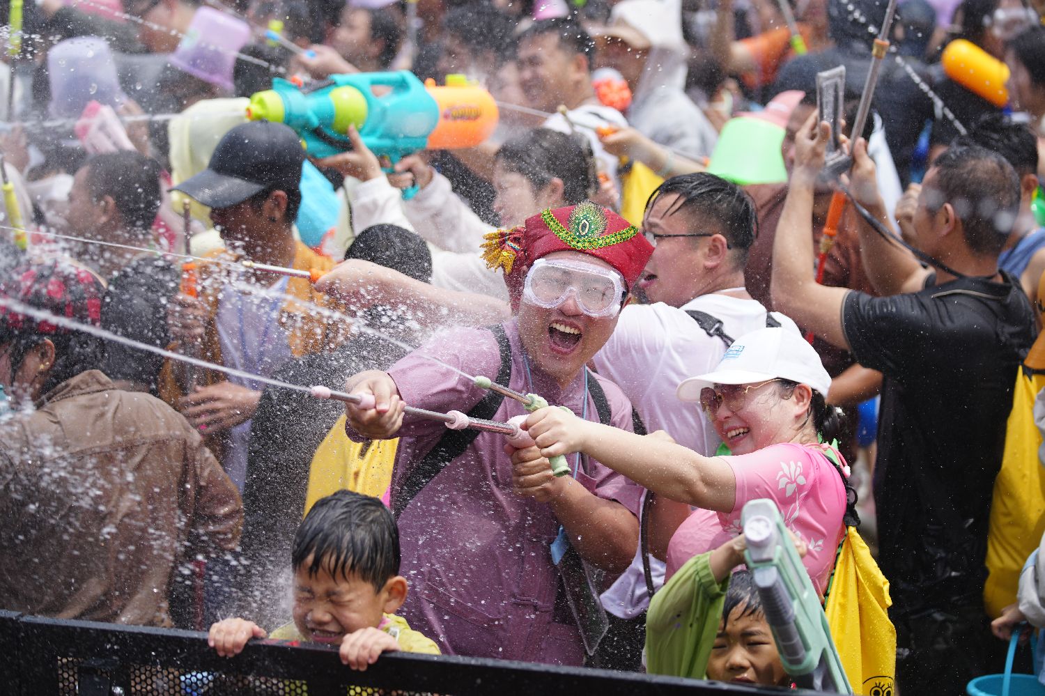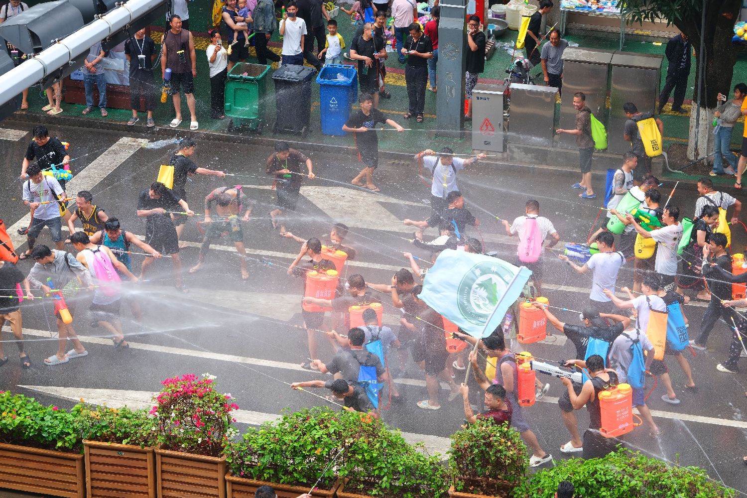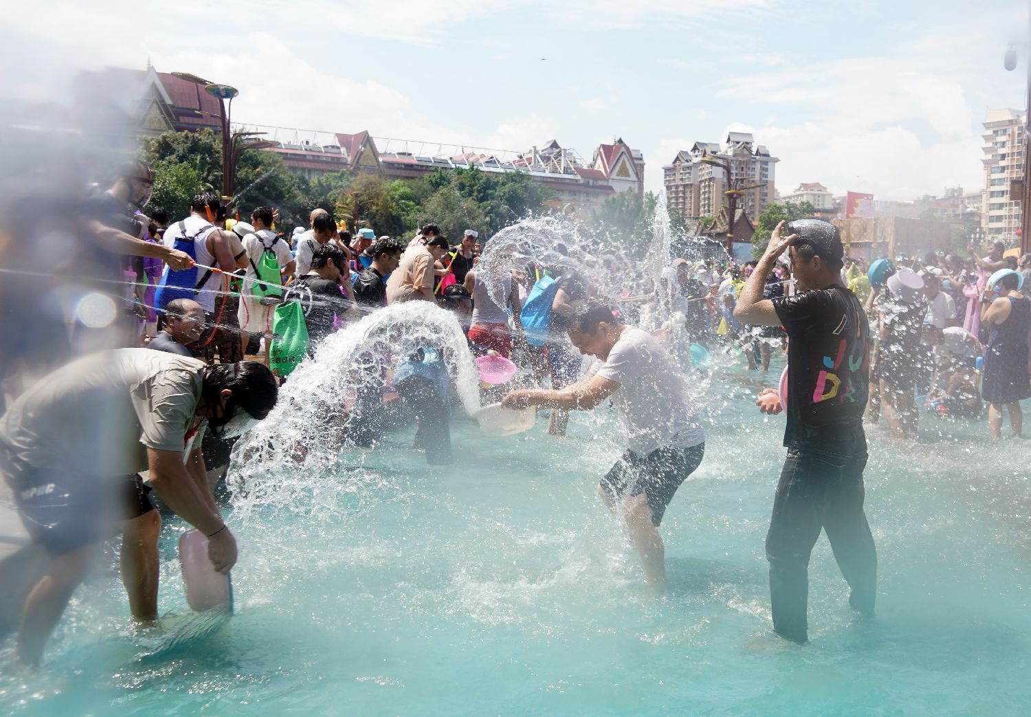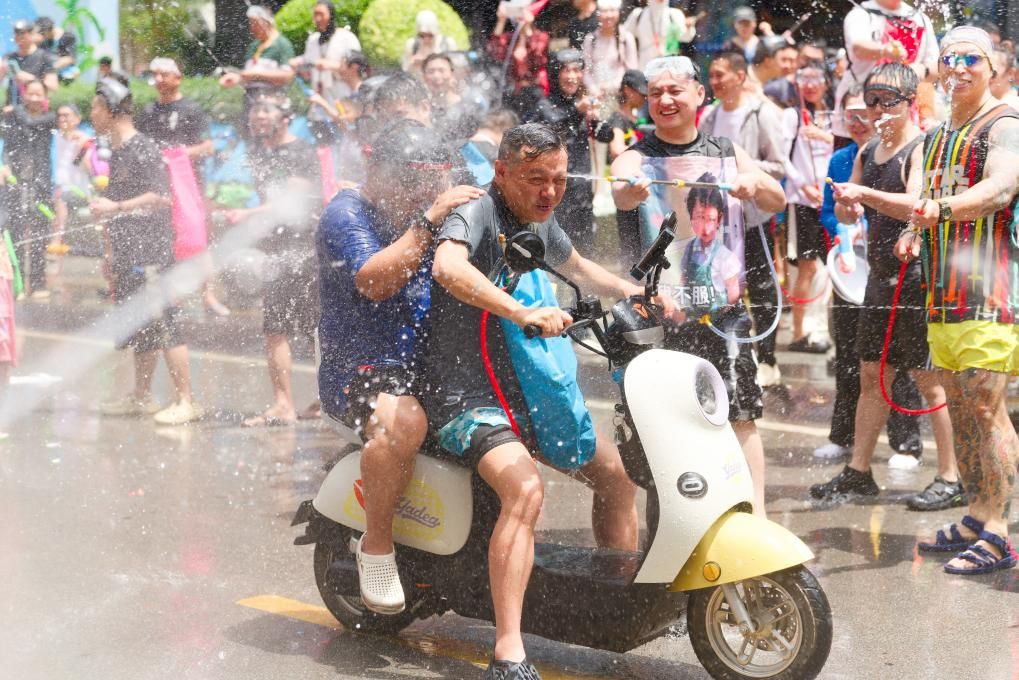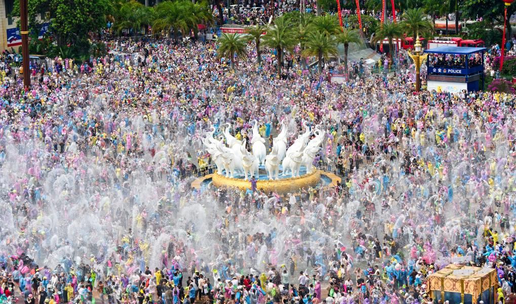 4月15日,云南省西双版纳傣族自治州举行泼水狂欢活动,人们欢聚在景洪市泼水广场,用相互泼水的方式互送祝福,庆祝泼水节。(中新图片)