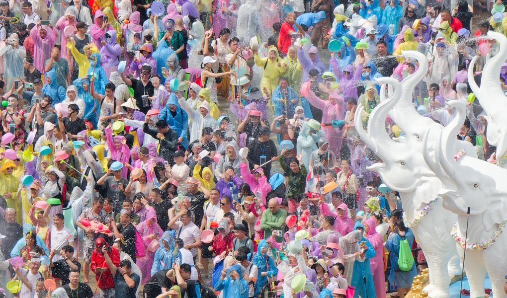 4月15日,人们在云南省西双版纳傣族自治州景洪市泼水广场泼水狂欢。(新华社)