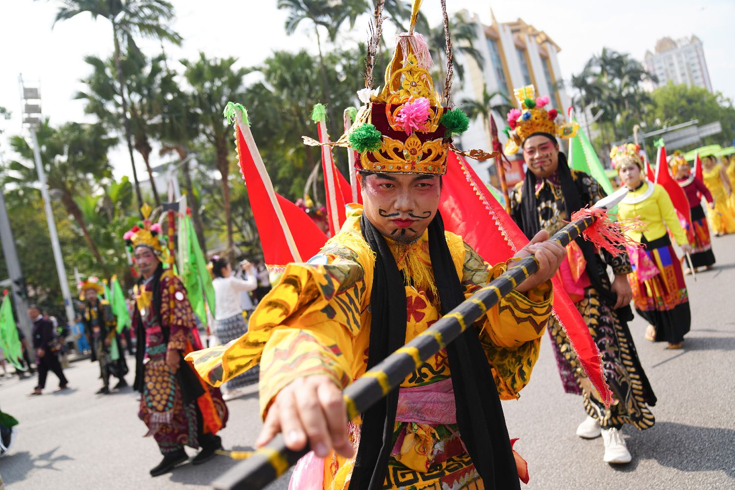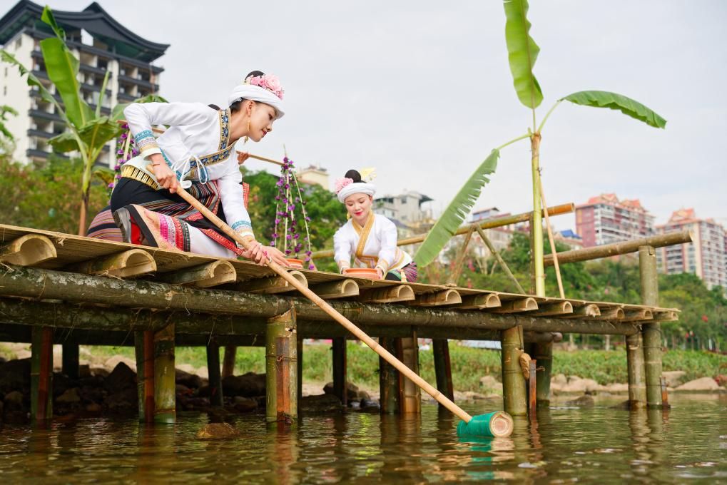4月12日,云南德宏傣族景颇族自治州芒市在泼水节期间举行民族文化巡演,向市民和游客展示当地传统文化和民族风情。(中新社)